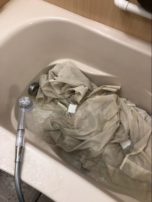 しばらく時間が経つと浴槽のお湯がこんな泥水みたいに真っ黒になりました。1時間ほど浸け置きしたら洗濯機でもう一度普通に洗濯しました。いいにおいの柔軟剤も使用しましたがいつもよりもっと香の効果が感じられました。