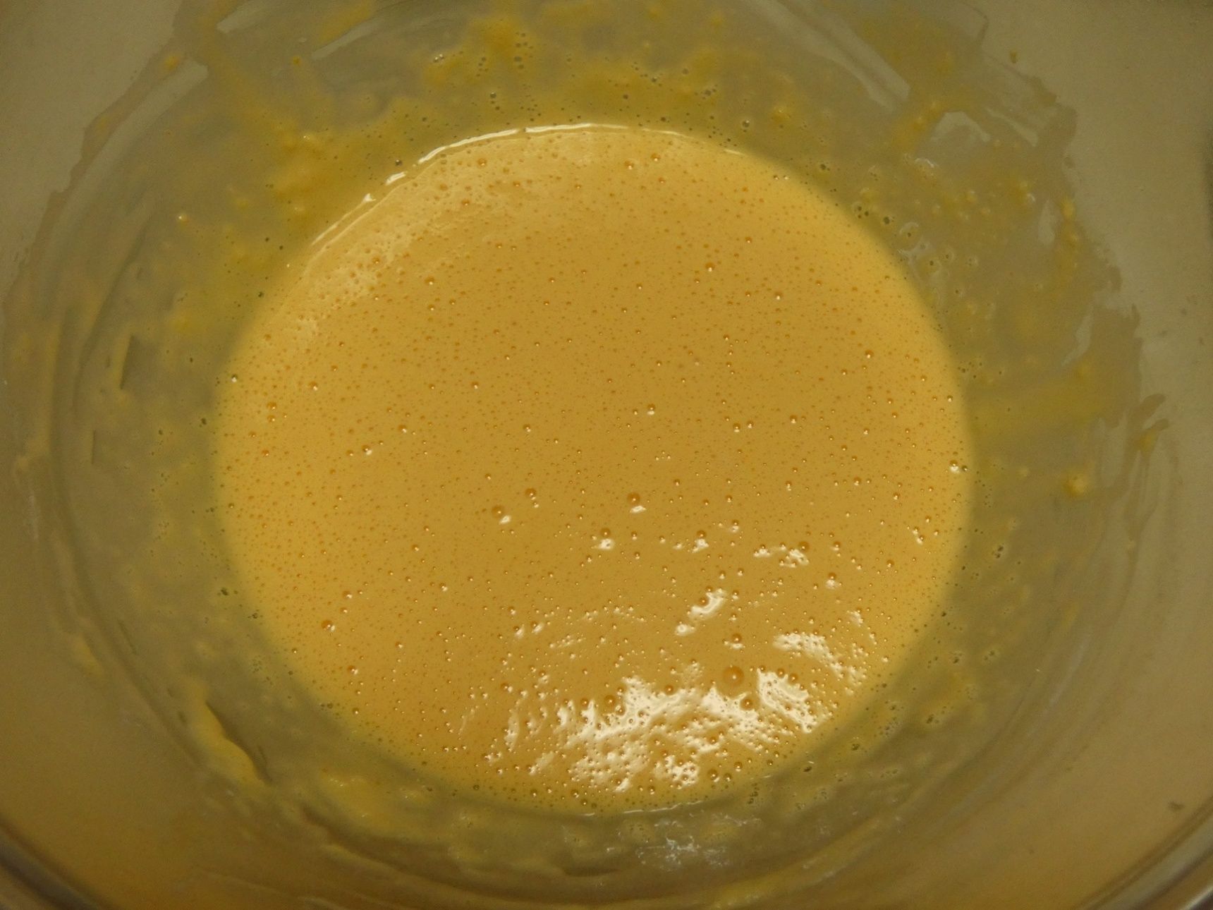 卵黄と卵白に分け、卵白に砂糖の半分を混ぜ合わせ、しっかりつのが立つまで泡立てます。
