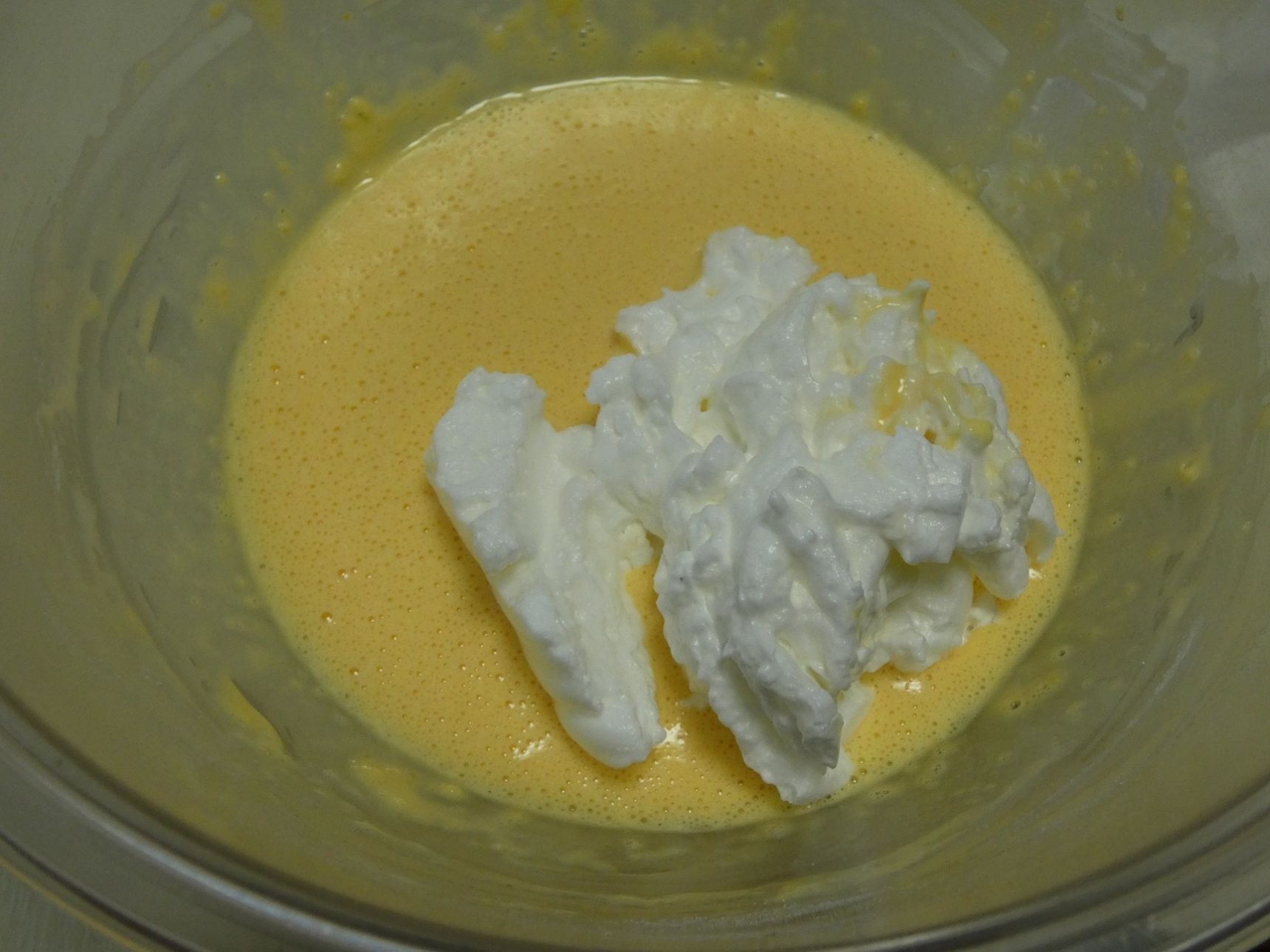 メレンゲ1/3量を混ぜ合わせたら、残りのメレンゲも混ぜ合わせます。