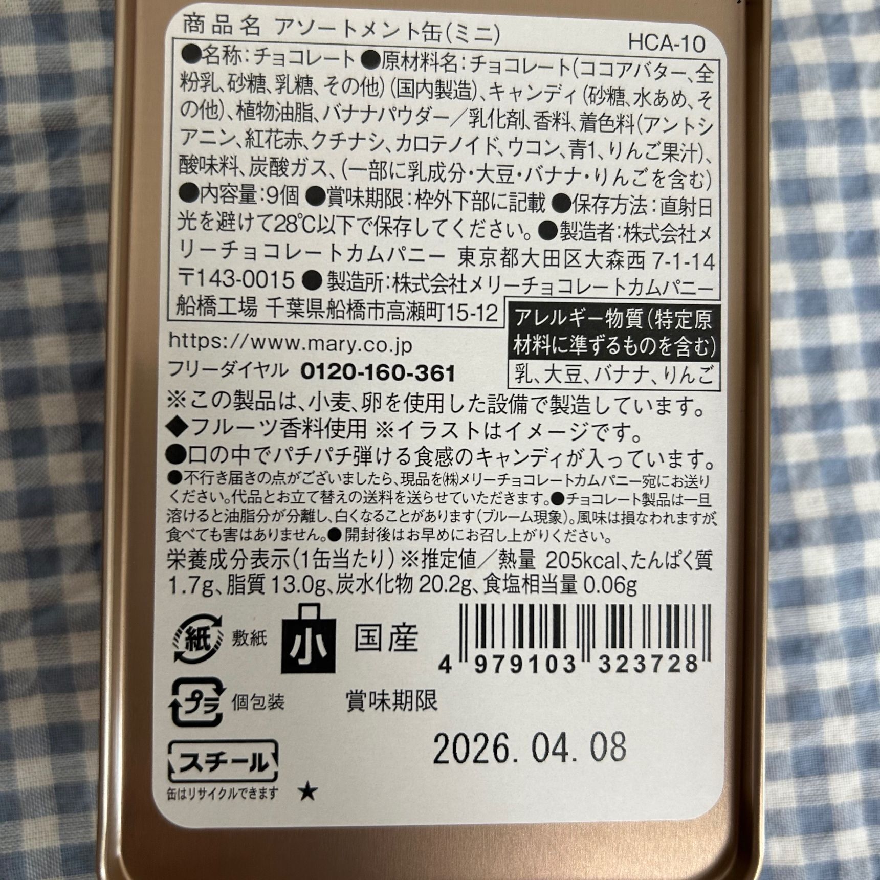 缶の裏面をよく見ると、「口の中でパチパチ弾ける食感のキャンディが入っています」と書かれていました!この一文を購入時は見落としていましたが、見ていても「どんなチョコ??」とワクワクは一緒だったかな〜と思います。
