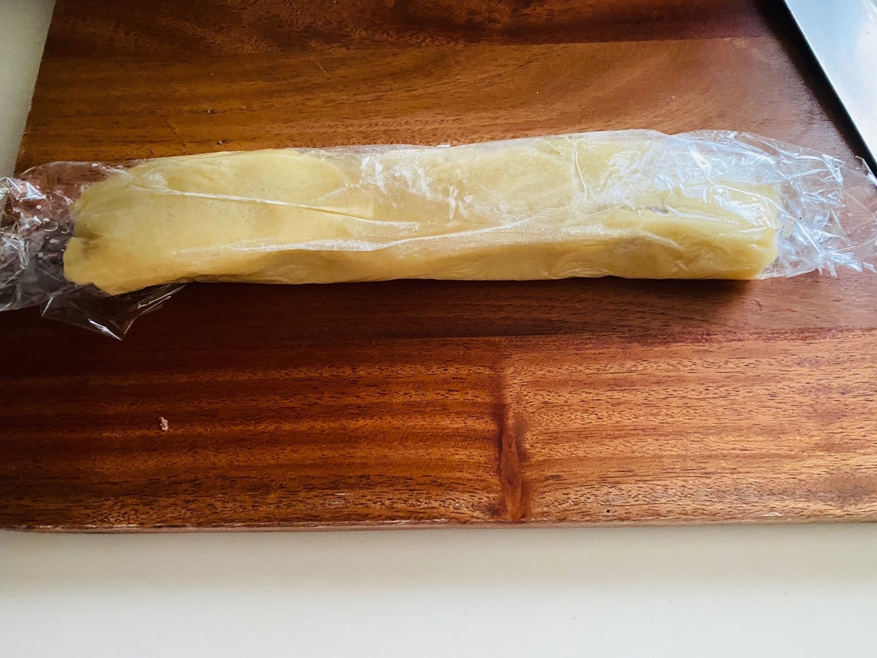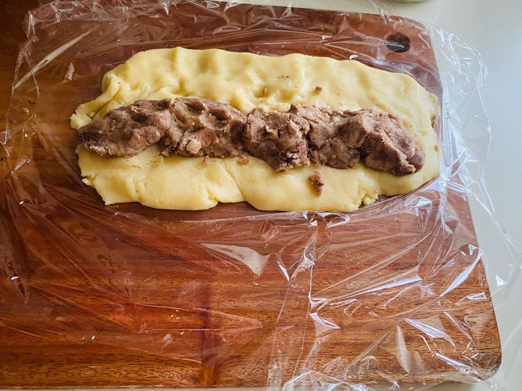 まな板にサランラップをしき、プレーンの生地を伸ばします。