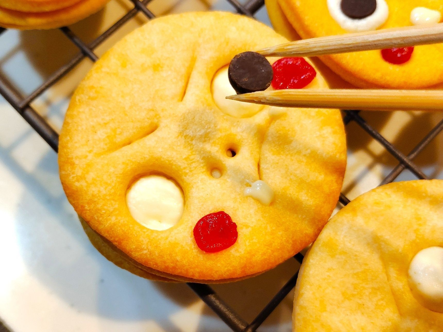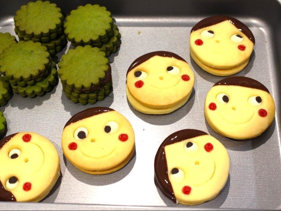 クッキーの顔パーツをつけていない方にスプーンなどでぬり、顔パーツのほうのクッキーを重ねて軽くおして密着させる。