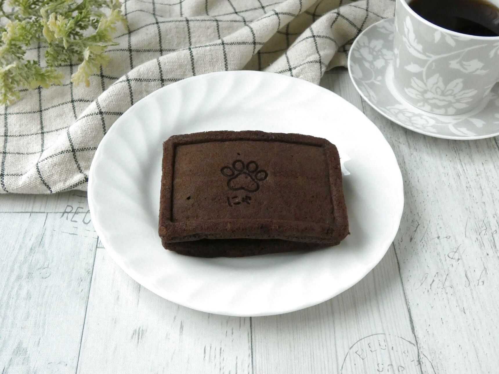 開けるとふんわりとした黒いカステラ生地に、足跡と「にゃ」の文字が刻印。食べる前から可愛さに癒されます。