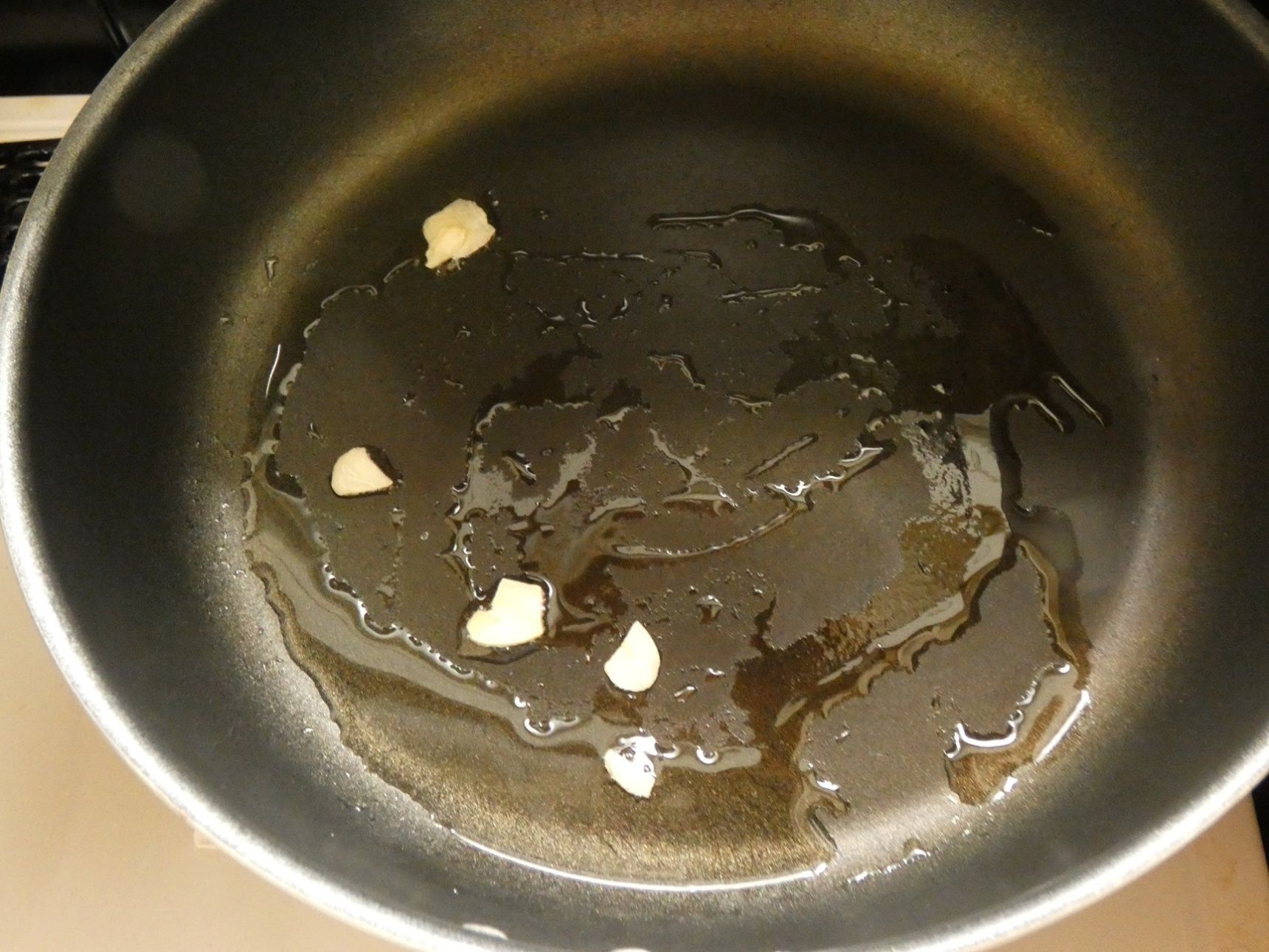 フライパンに油とガーリックチップを入れて弱火にかけます。