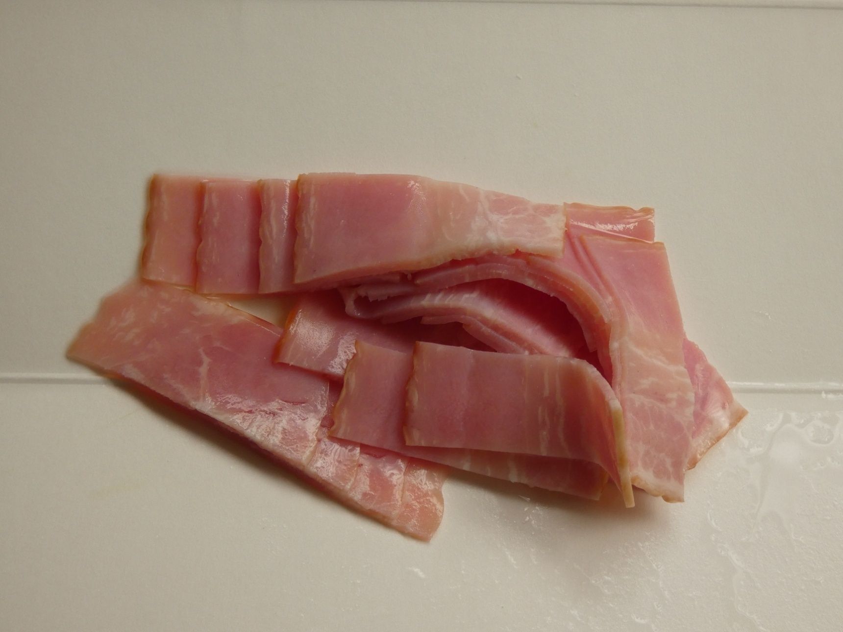 香りが出てきたらガーリックを取り出し、ベーコンと菜の花を炒めます。
