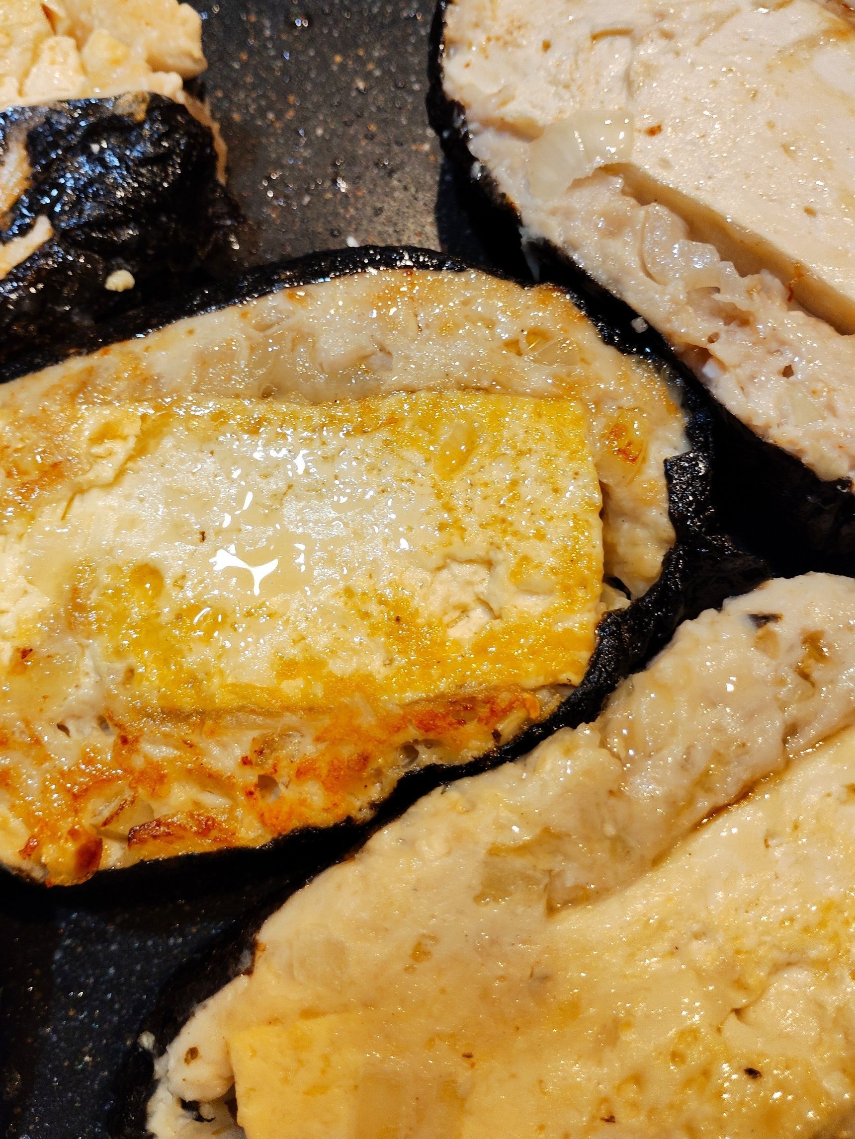 豆腐に片栗粉をまぶし、肉だねで豆腐を包んで、海苔の上に置く。