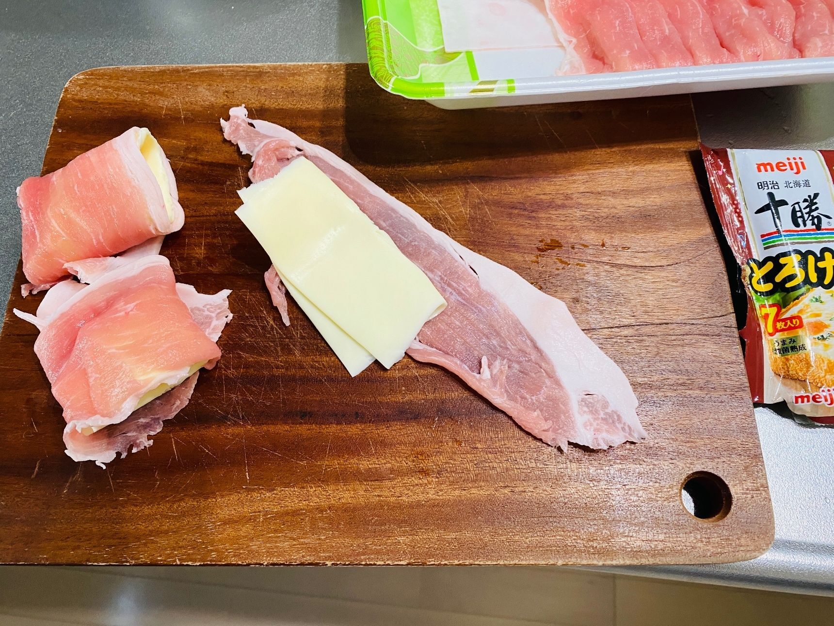 豚肉に塩胡椒します。 チーズを畳んでのせます。 小麦粉、マヨネーズ、パン粉の順番に衣をつけて揚げます。よく油を切ります。 冷めたら、お弁当に詰めます。