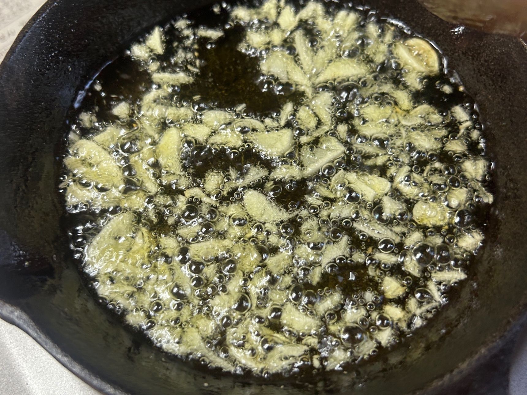 ニンニク・オリーブオイルをスキレットに入れ熱する