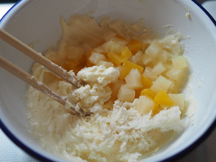 3.2に水切りしておいたヨーグルト、フルーツ缶(それぞれのフルーツを1cm角ぐらいに切る)、くり抜いたフランスパンの中身を加え、混ぜ合わせます。