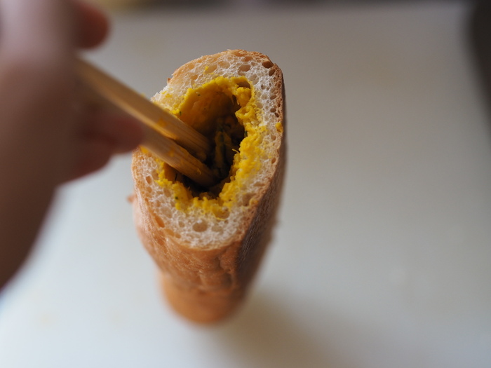 1.フランスパンを半分に切り、2本の菜箸を開き気味にして中にさして回すようにして中身をくり抜きます。