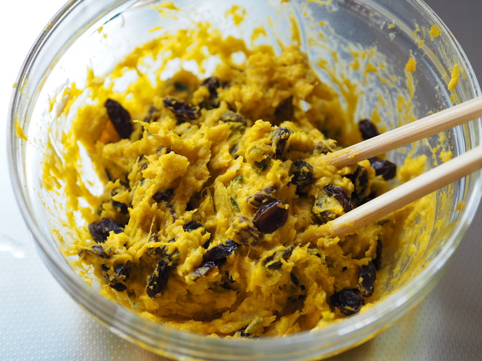 2.蒸したかぼちゃをよく潰し、熱いうちに☆の材料と1でくり抜いた中身のパンを入れよく混ぜ合わせます。