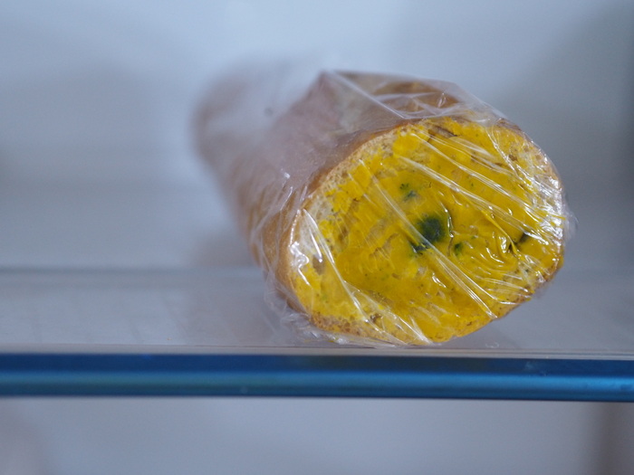 4.1の中に3を詰めます。詰め終わったフランスパンにラップを巻いて冷凍庫で凍らせます。
