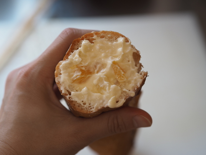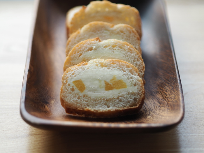 こちらも白に黄色にと切り口がキレイで、食べるのがもったいないくらいです。味は、ほんのり酸味が利いたクリームチーズがフランスパンの甘さとよく合います。ワインのおつまみにも良さそう♪冷凍しておけるので急な来客などにも重宝しますよ。