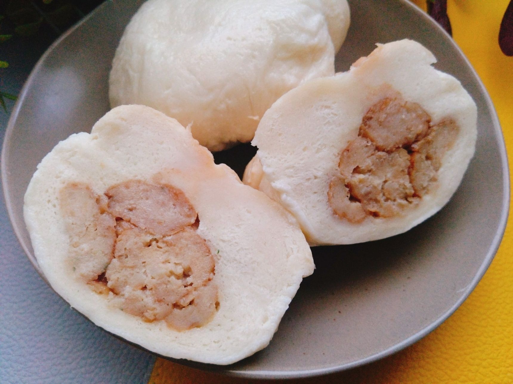 1.ラップの上に食パンをのせてスプーンなどで窪みを付けたら、潰した肉団子をのせてラップを持ち上げて食パンを半分に折ったらラップで包む