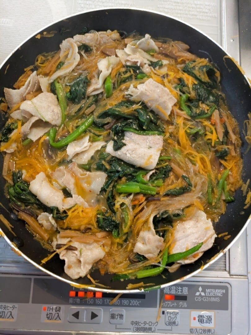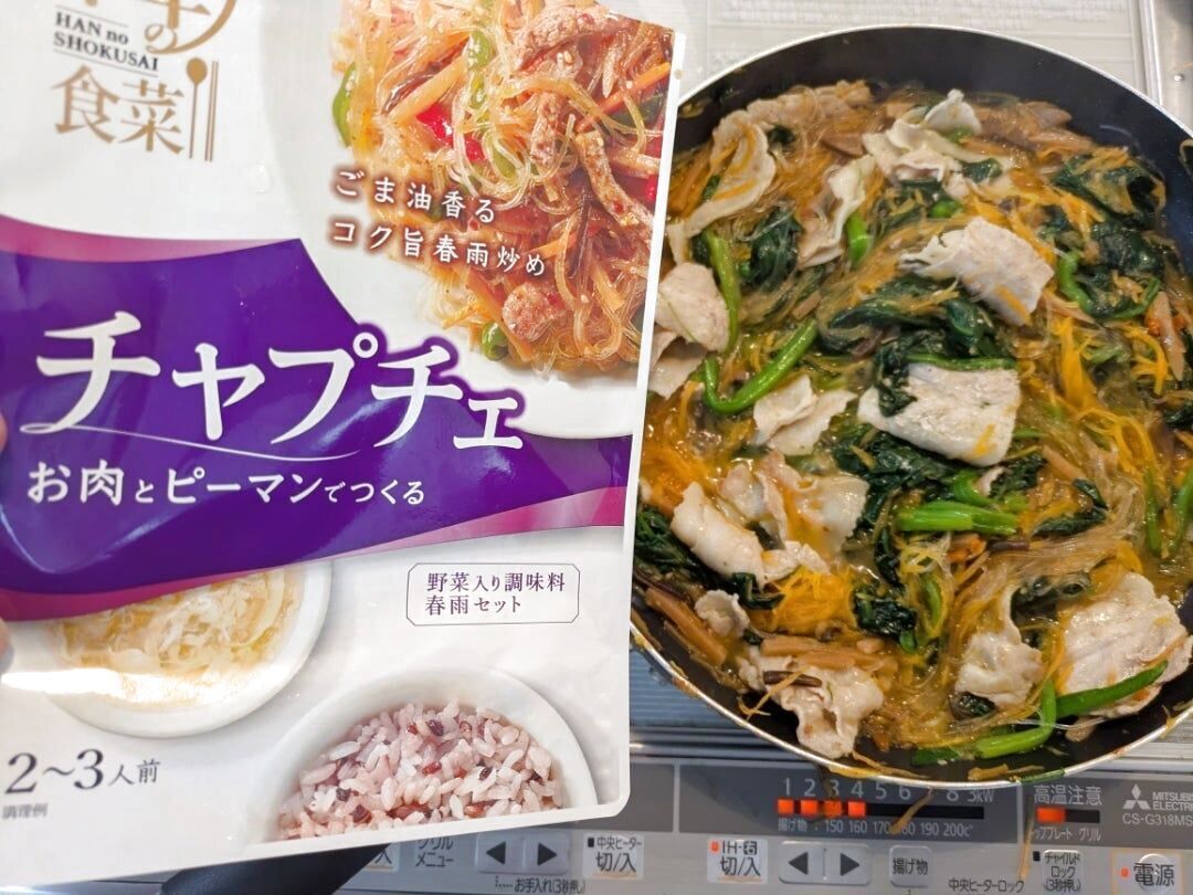 そしてもう一つ簡単に美味しいチャプチェが、作れちゃうモランボンの『韓の食菜チャプチェ』298円です。野菜入り調味料と春雨のセットで、今回は、豚バラ・ほうれん草1束・人参1本を入れて作りました。