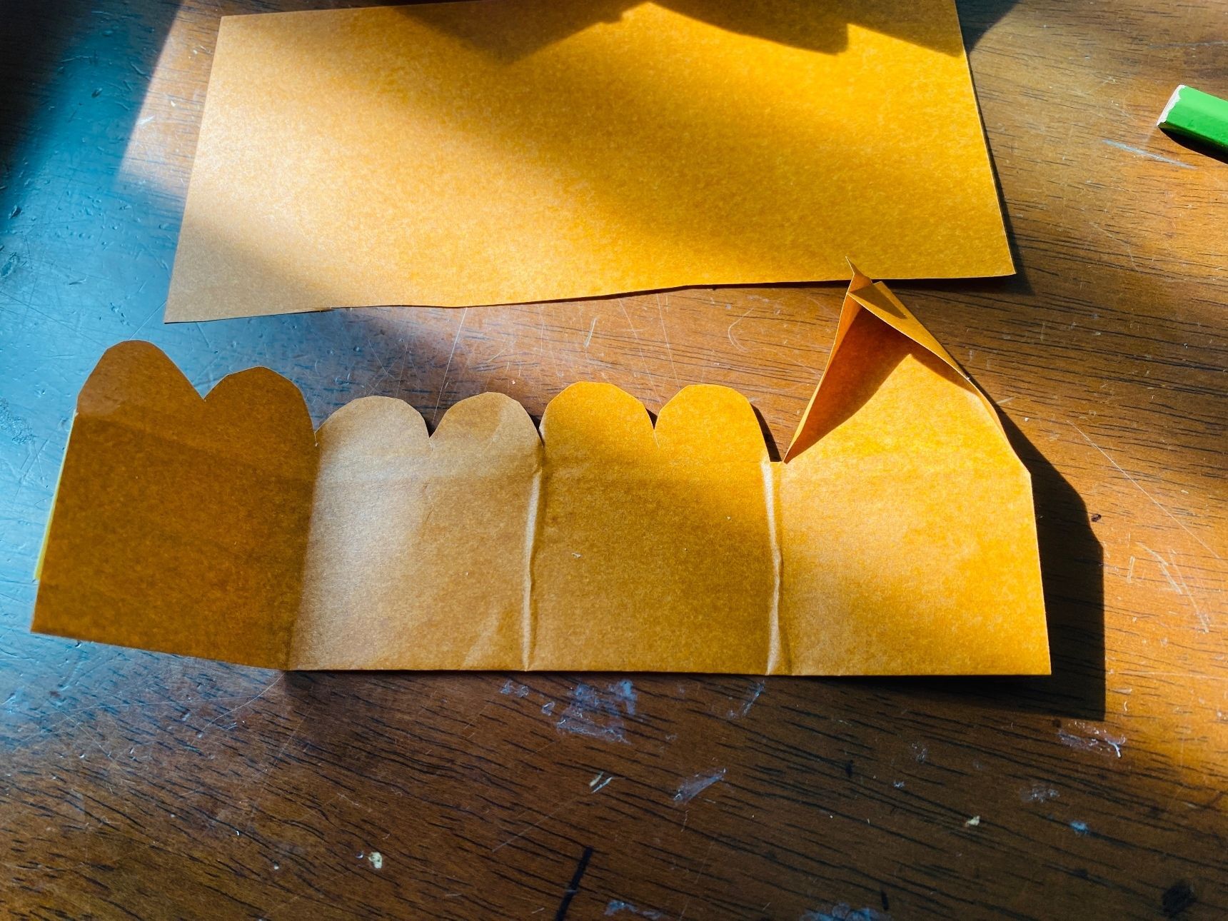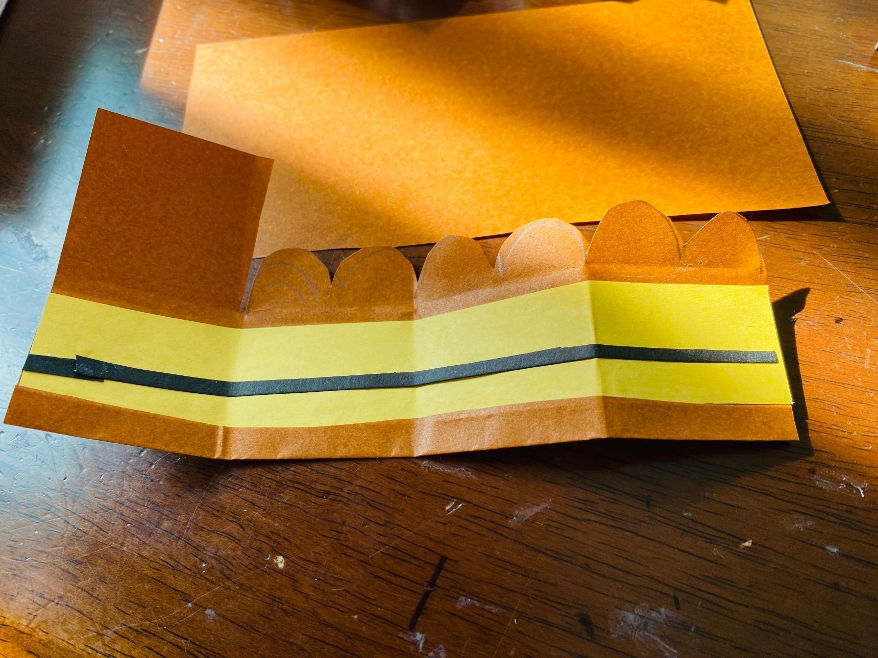 また、ひっくり返し、波打つ山のところにのりをつけて貼ります。クリームがかかったように見せるためです。三角に折ったところにのりをつけて回転していくようにのりで留めます。