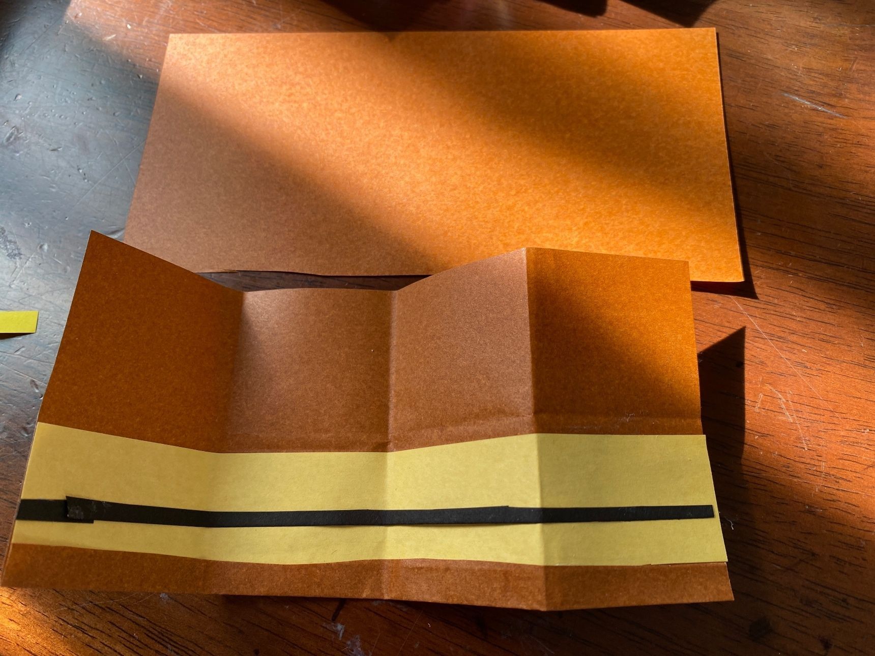 半分下に色違いの折り紙をのりで貼ります。真ん中に細く切った折り紙を貼ります。