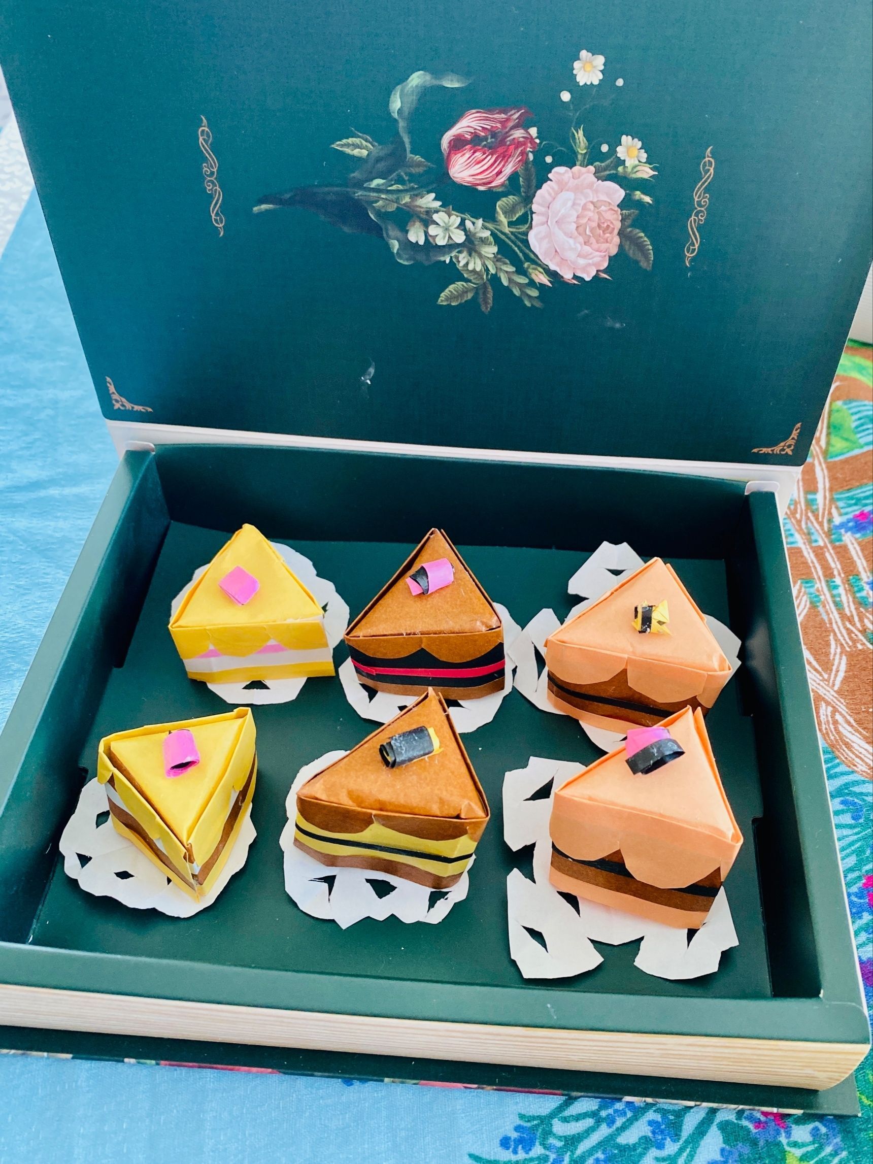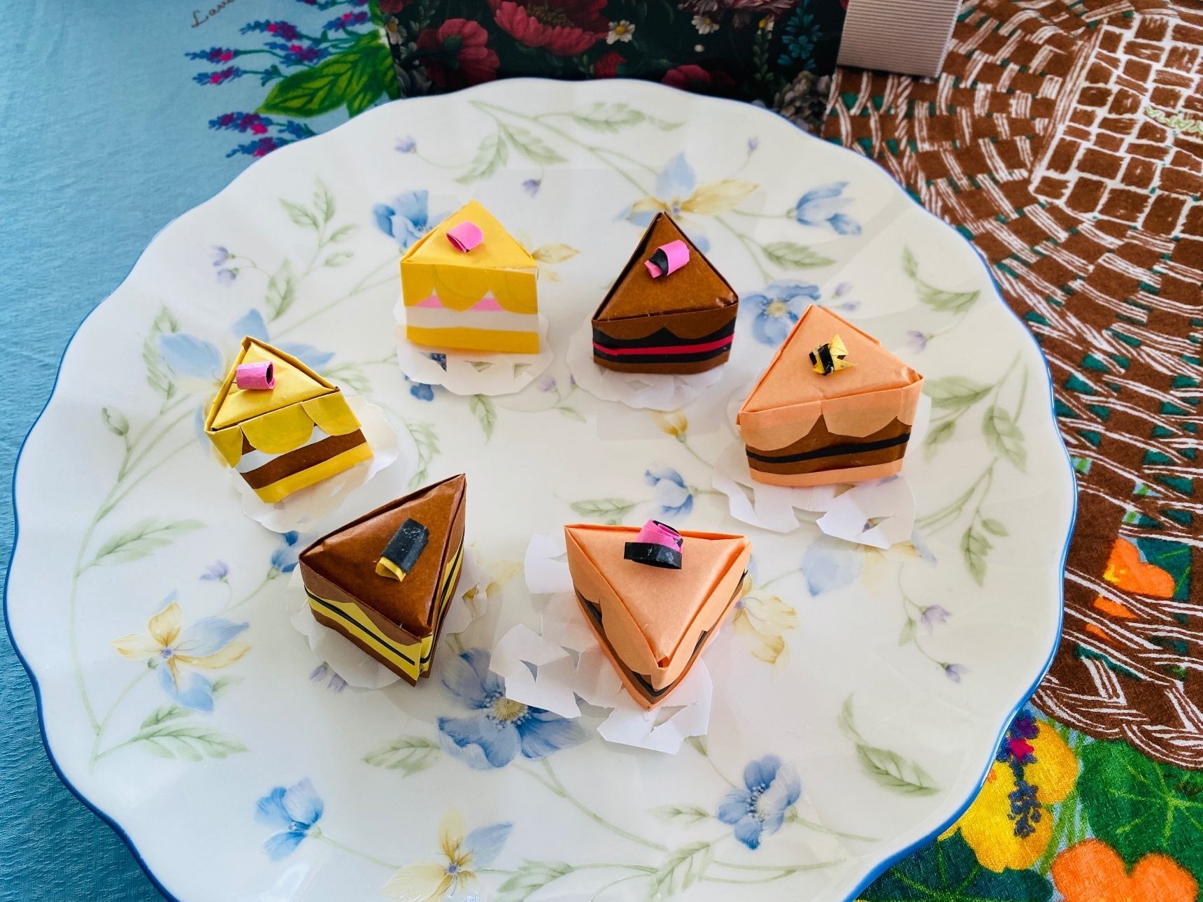 折り紙で作ったショートケーキ作りはお好きな色で作ってみてね。楽しいよ。
