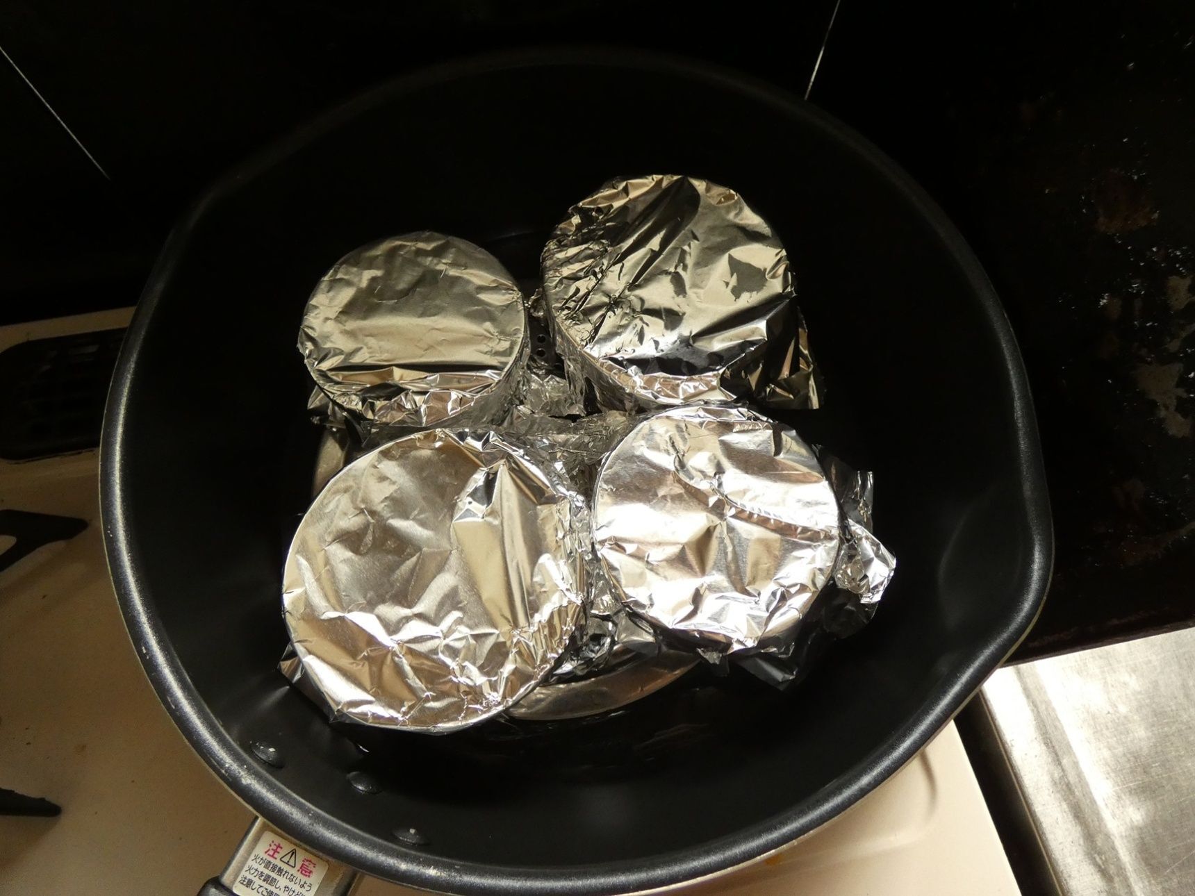 3.こしながら耐熱カップに入れ、アルミホイルをかぶせます。