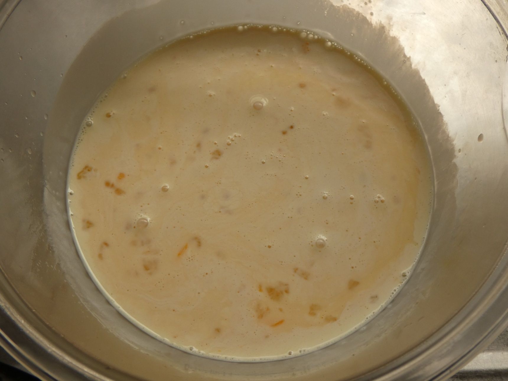 2.溶いた卵に1と生クリーム、残りの牛乳を混ぜ合わせます。