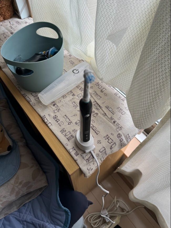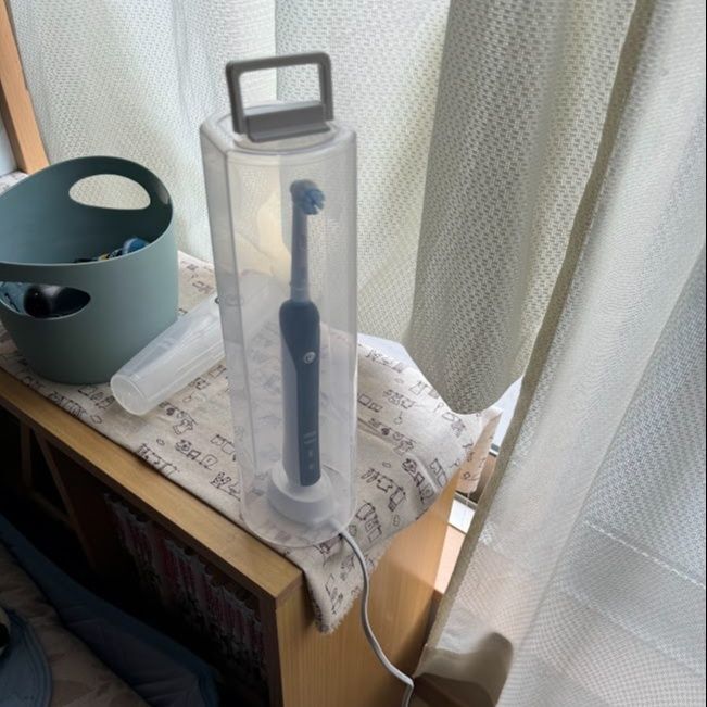 充電中の電動歯ブラシに作った「専用ケース」をそっとかぶせてみました。