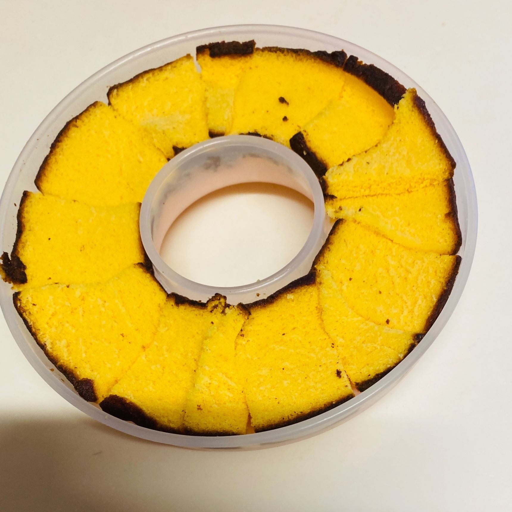 ④薄くカステラをカットしてのせ、サランラップをかけて冷蔵庫で冷やし固めます。