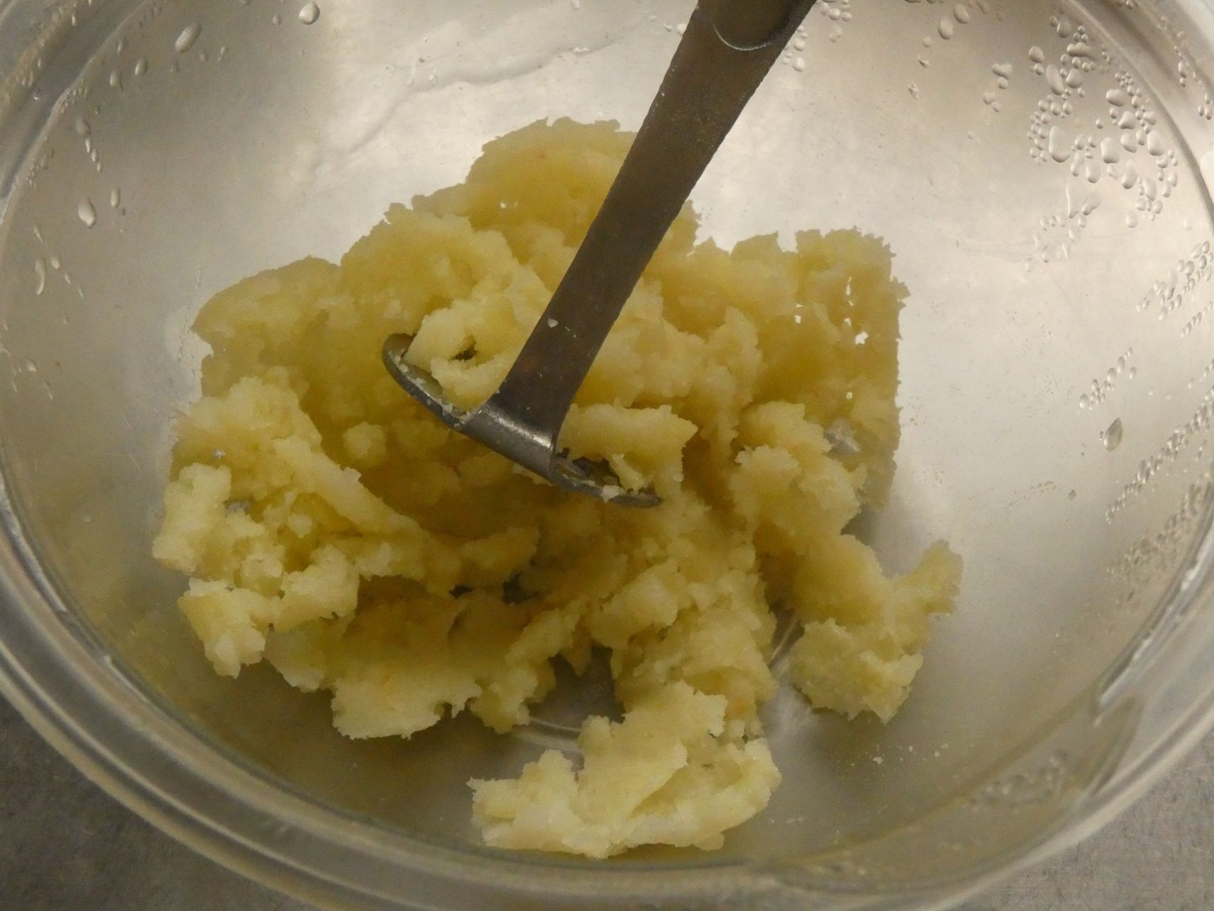 じゃが芋は1cmの輪切りにし耐熱容器に入れます。ふんわりラップをして電子レンジ600Wで3分加熱し、熱いうちにつぶします。