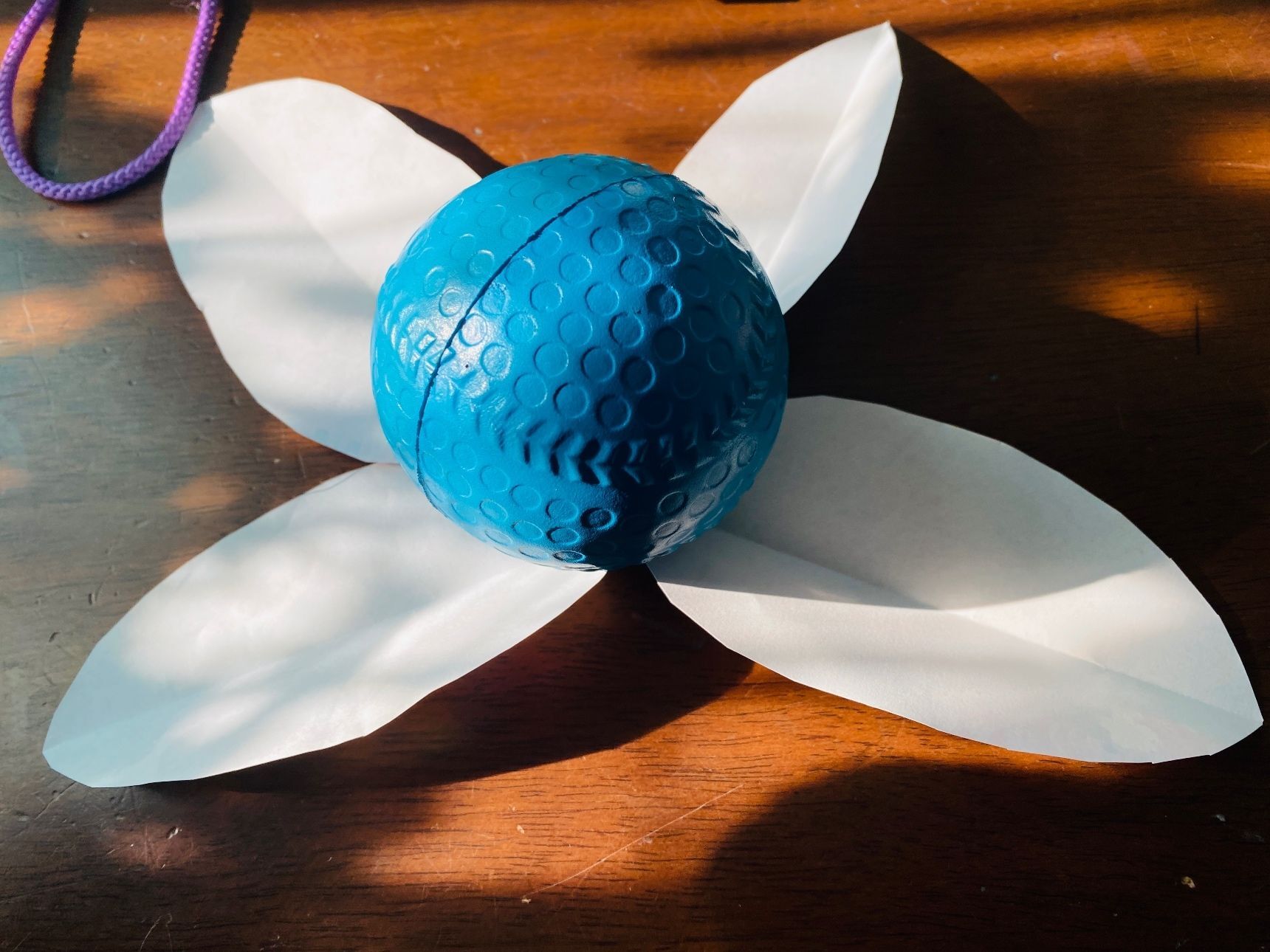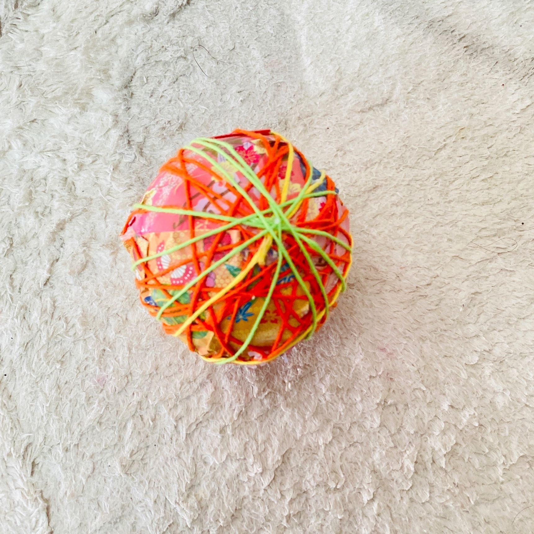 家に眠っていたゴムボールに折り紙を木の葉型にハサミで切ってのりで貼ります。