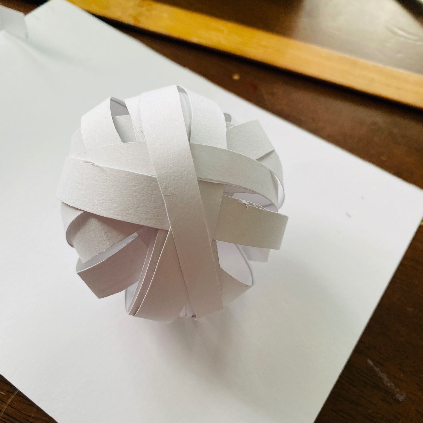 球体ならなんでも作れますが、もしお家になかったら、A4サイズの横側を1cm幅にハサミで切って、端と端をのりで貼って、↑写真のように重ねていくと、作れますよ。