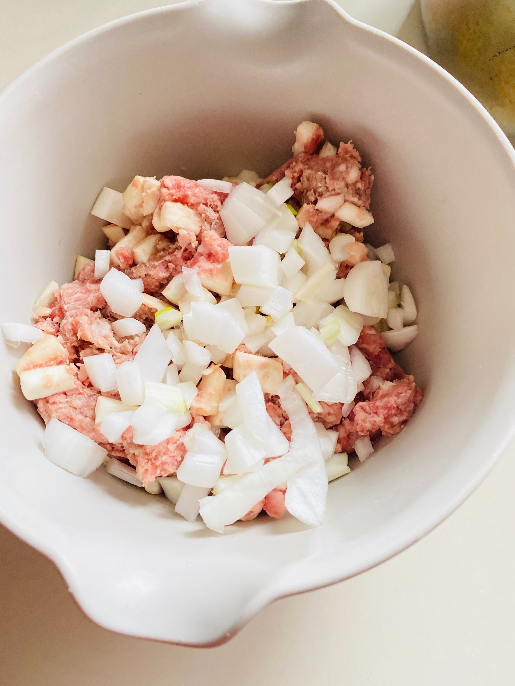 合挽肉に細く切った玉ねぎを加えよく混ぜます。
