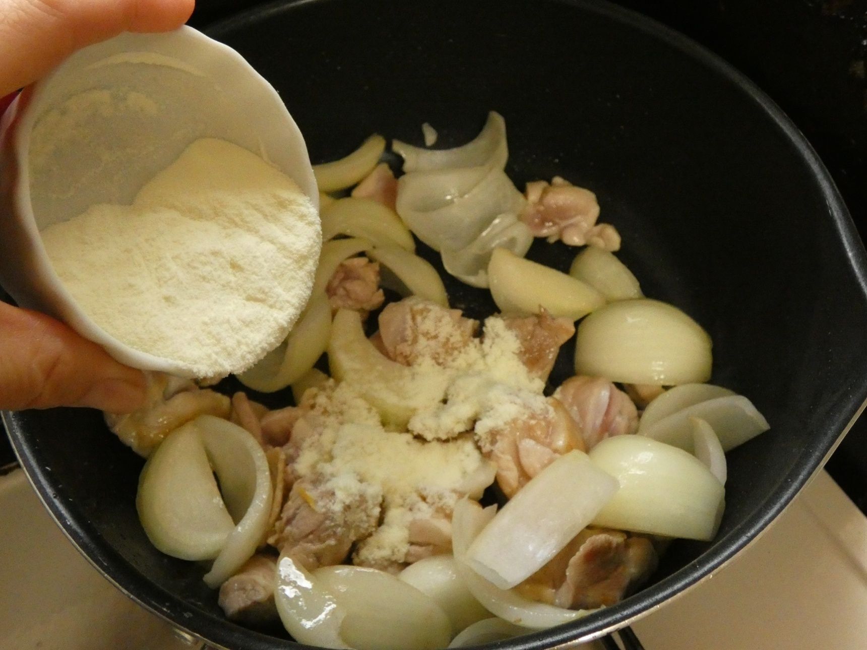 玉ねぎがしんなりしてきたら、一度火を止めます。薄力粉とスキムミルクをふり入れ、粉っぽさがなくなるまでよく混ぜます。