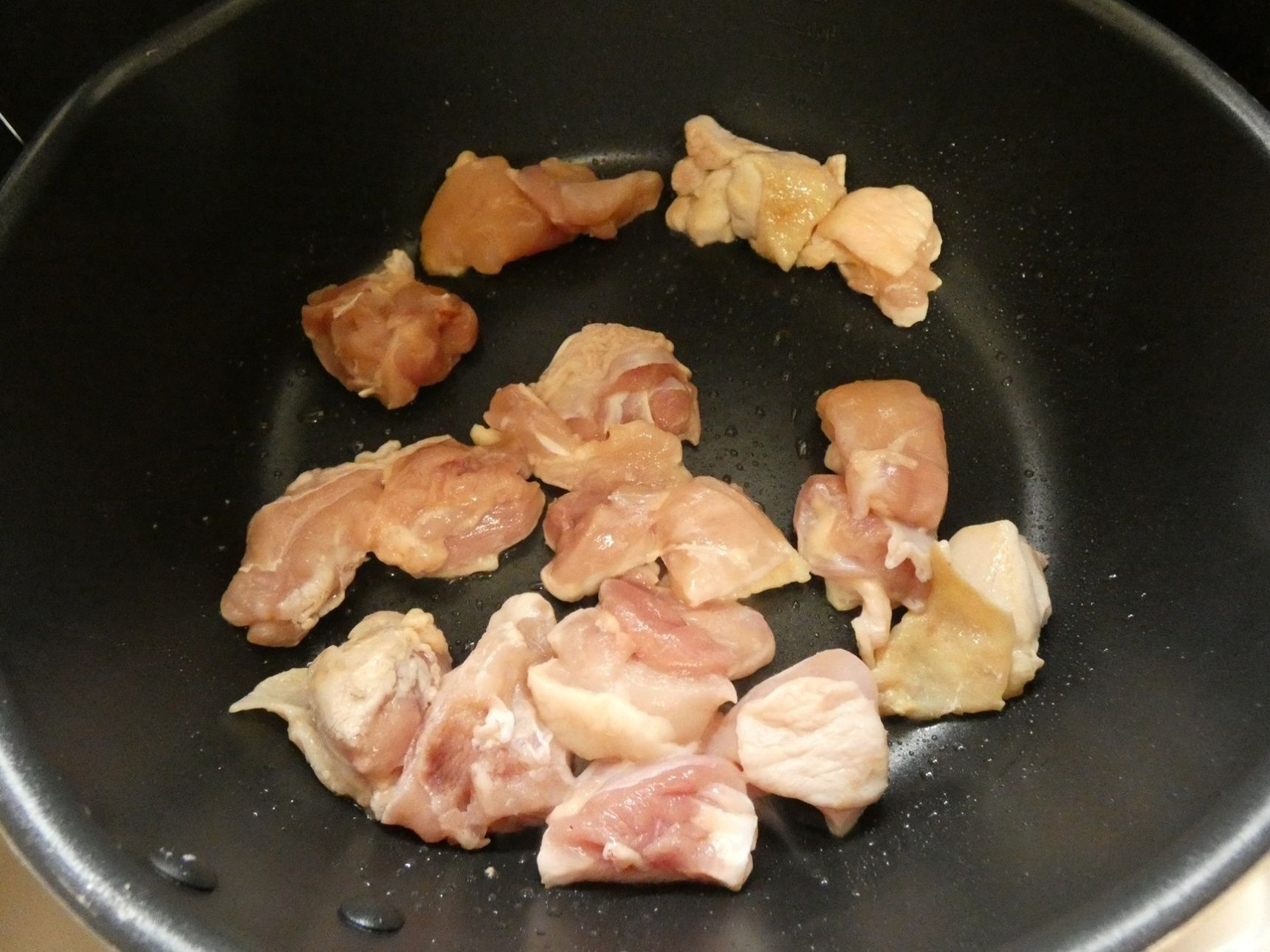 油をひいたフライパンで鶏肉を炒めます。
