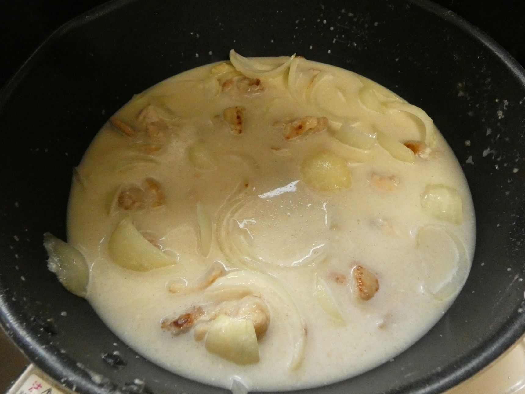 粉類を入れるときは必ず火を止めて、粉っぽさがなくなるまでよく混ぜます。スキムミルクを入れるとコクがアップします。