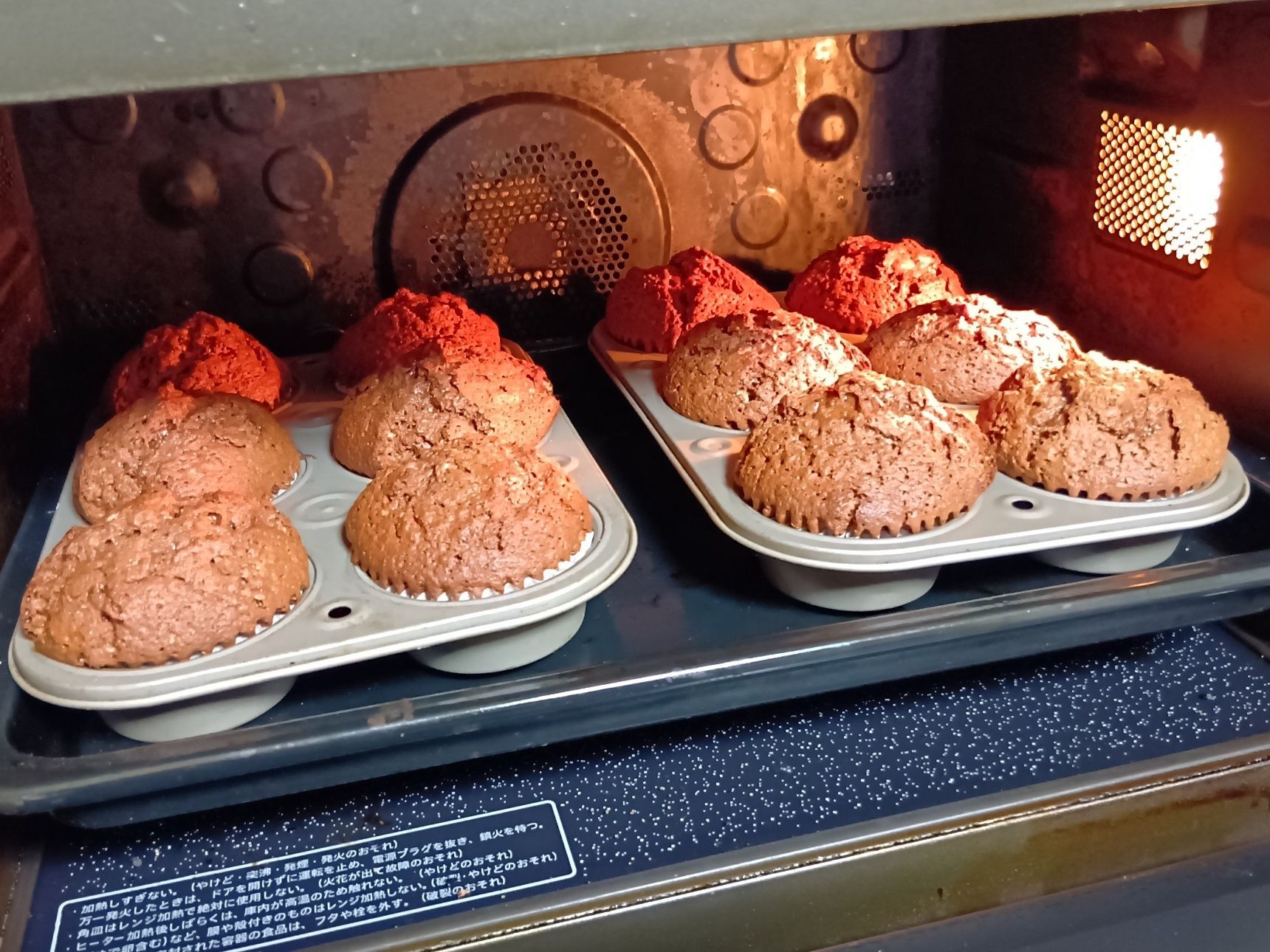⑥ カップを敷いたマフィン型(6個取り)に、生地をスプーンなどで均等に流し入れ、180度に予熱したオーブンで180℃×約25分焼きます。