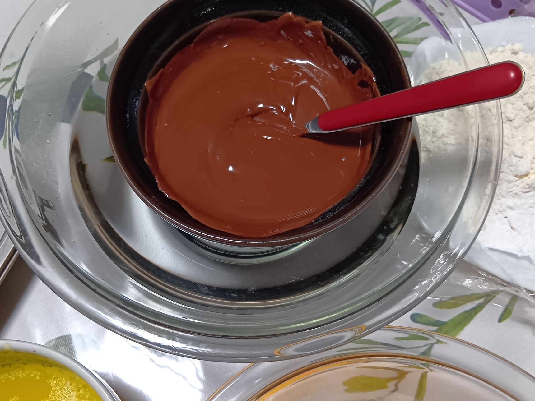 ① バターは湯せんにかけて溶かします。チョコレートも同様に湯せんで溶かし、使用するまで温かい状態を保っておきます。