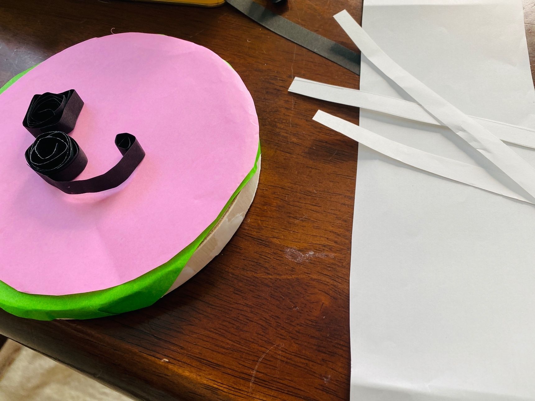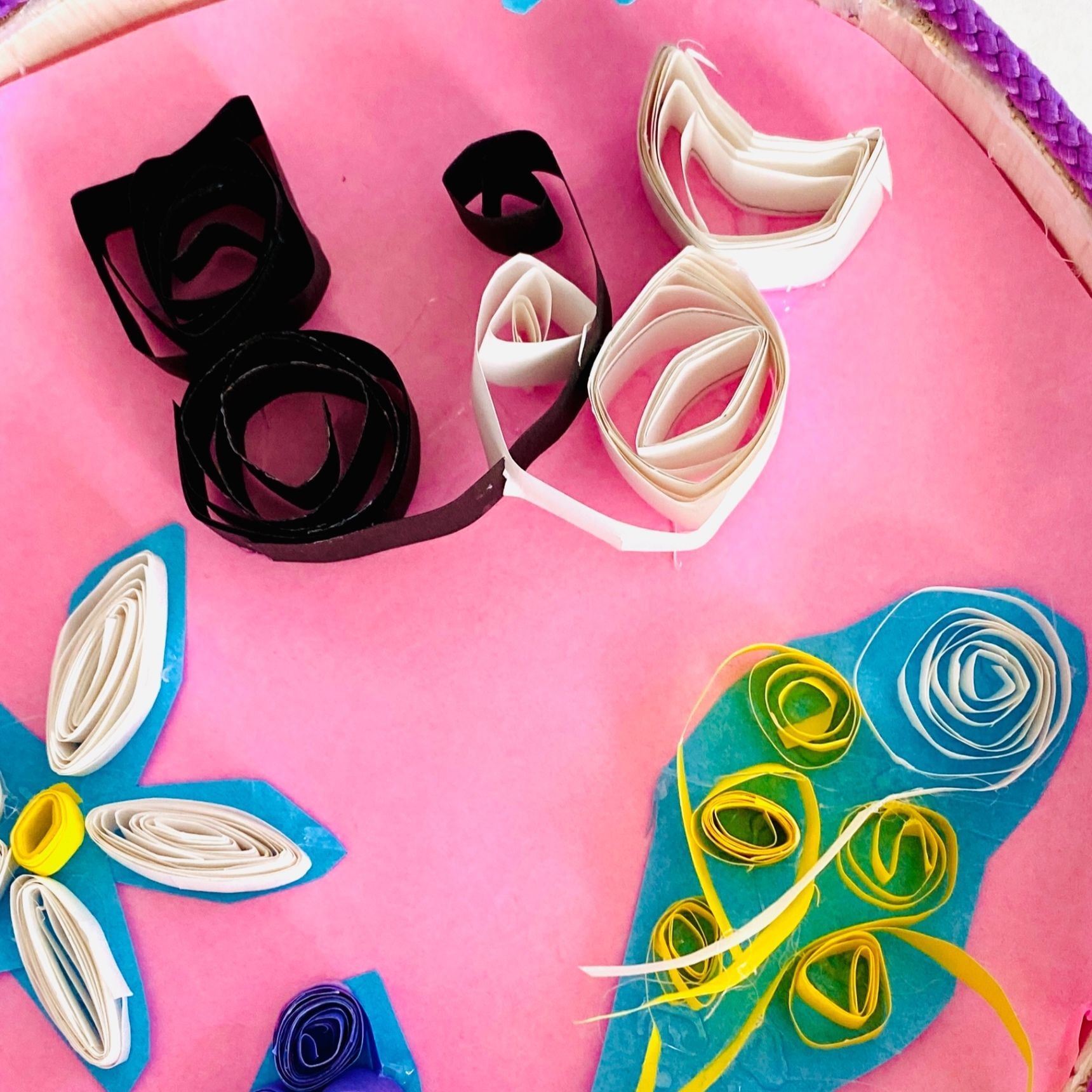 紙を巻いたら、黒い猫の方は、頭は丸く、耳の形を三角にとんがらせ、胴体は丸く形整えます。尻尾は片側だけ巻いて、胴体にのりで貼り付けます。
