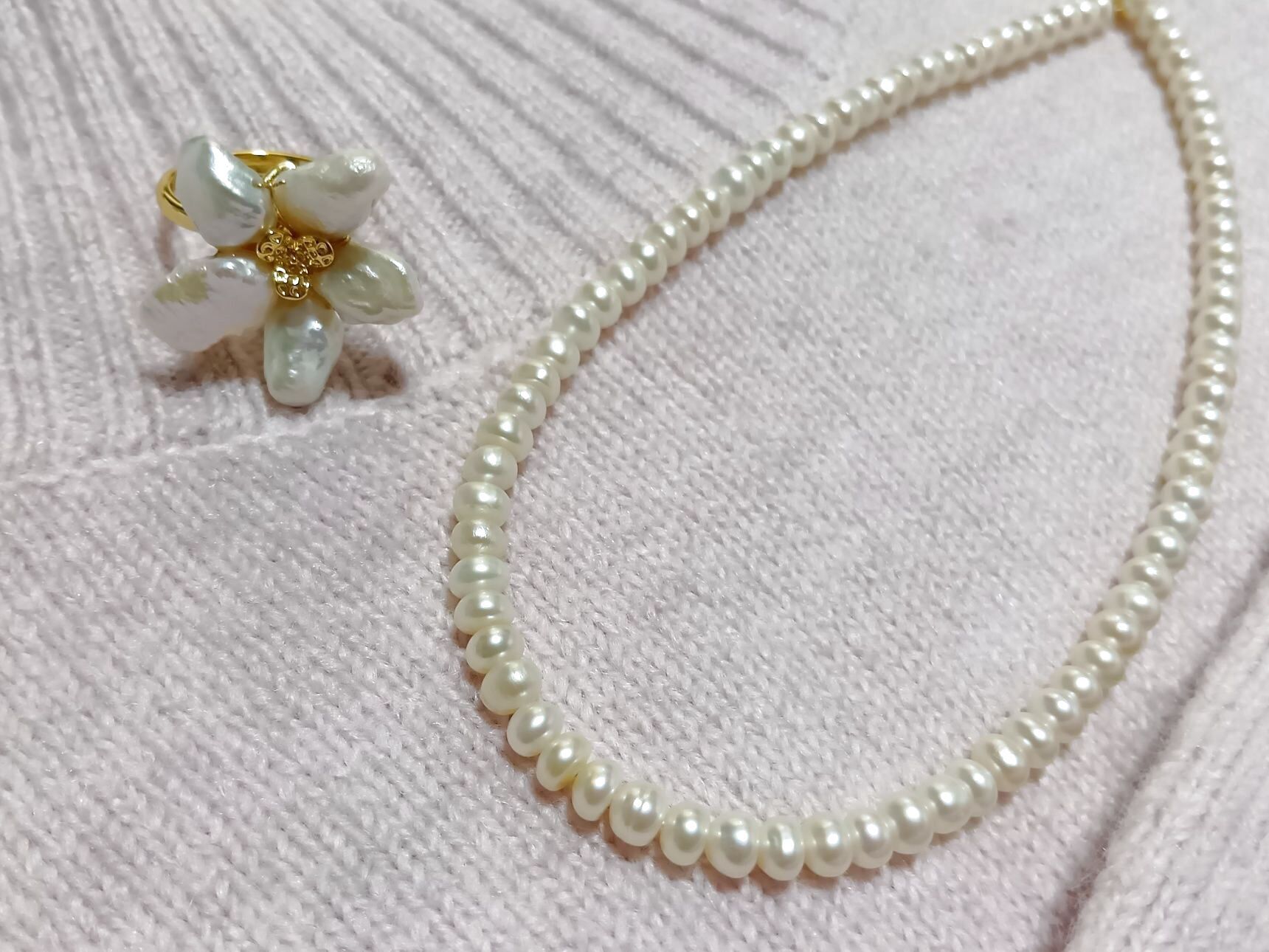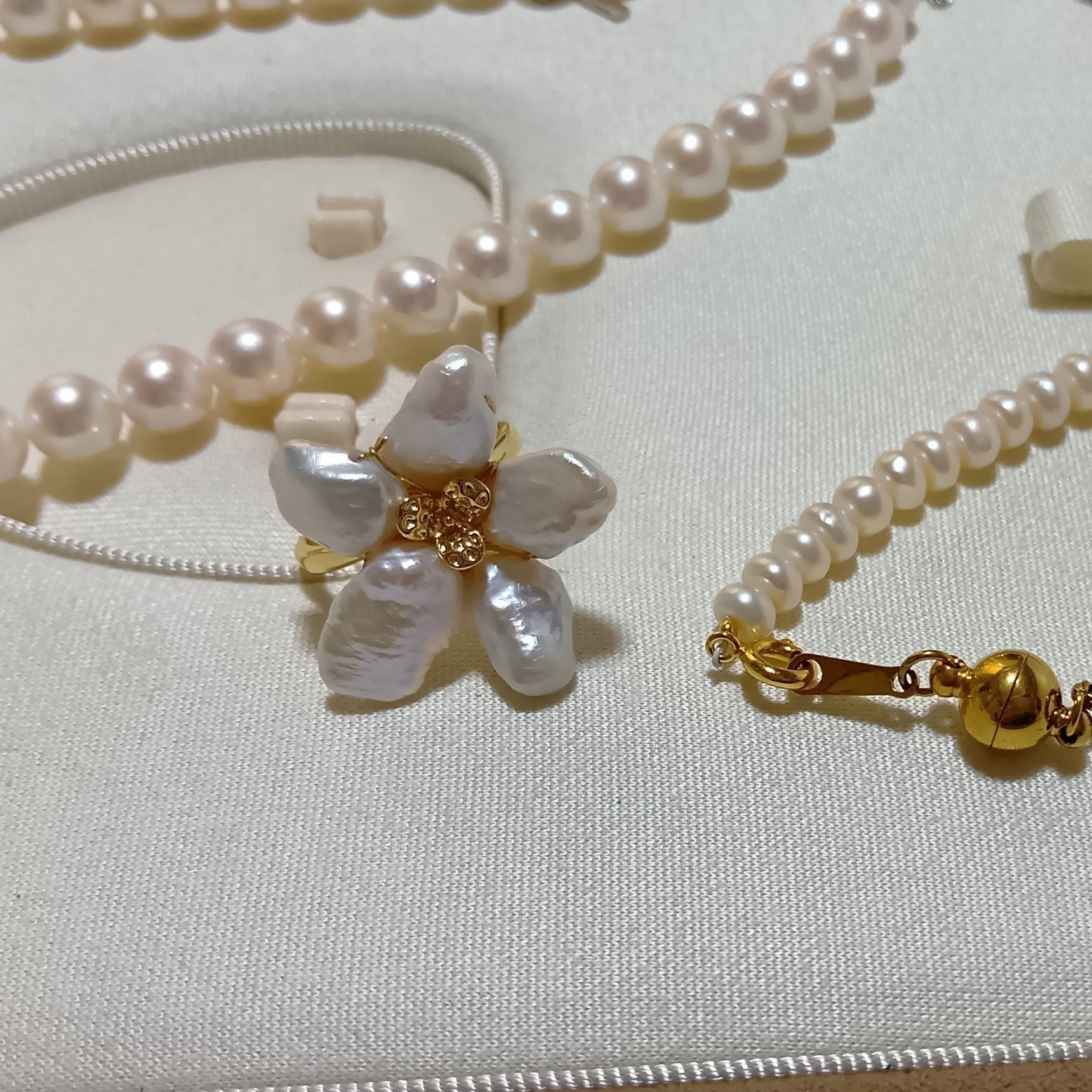 その時私は、一期一会的な個性的なお花モチーフのパールのリング(左側のリング)、そして、ネックレスを2点チョイスしましたよ。