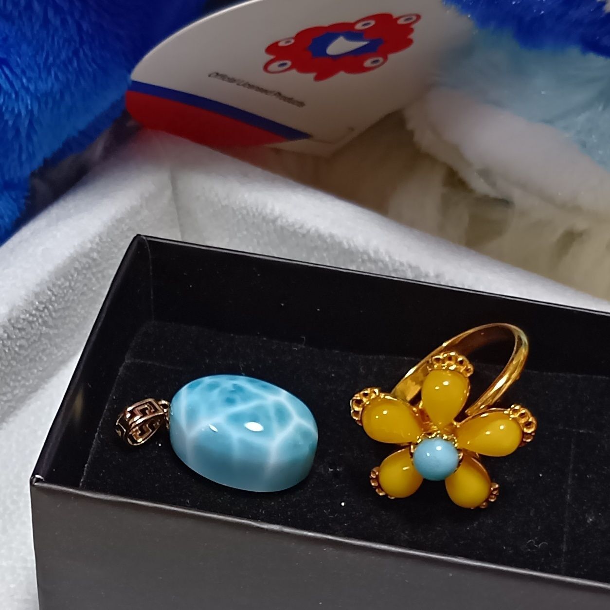 同じお店で、ミルキーアンバー&ラリマーのフラワーモチーフのリングも一緒に購入しました。