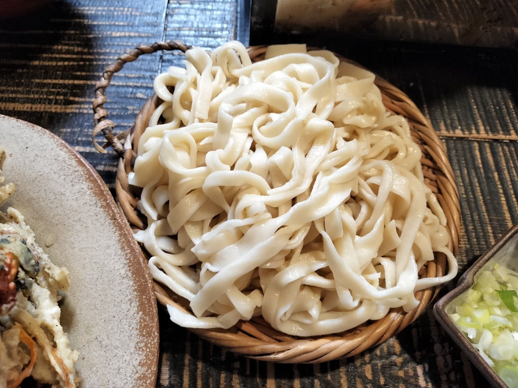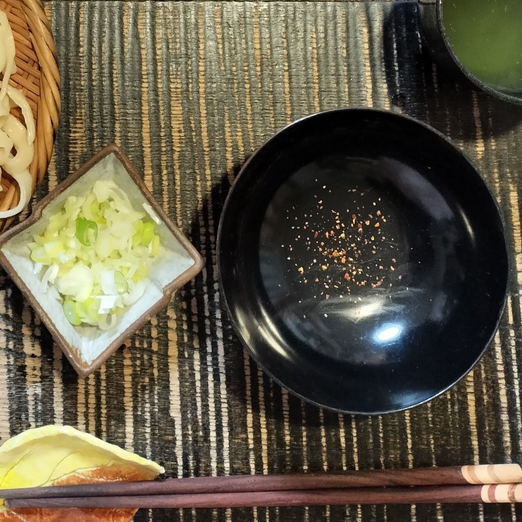 お椀に、七味唐辛子と長ネギを入れ、煮込みうどんの汁を注ぎ、冷たいうどんをつけて食べる【つけうどん】