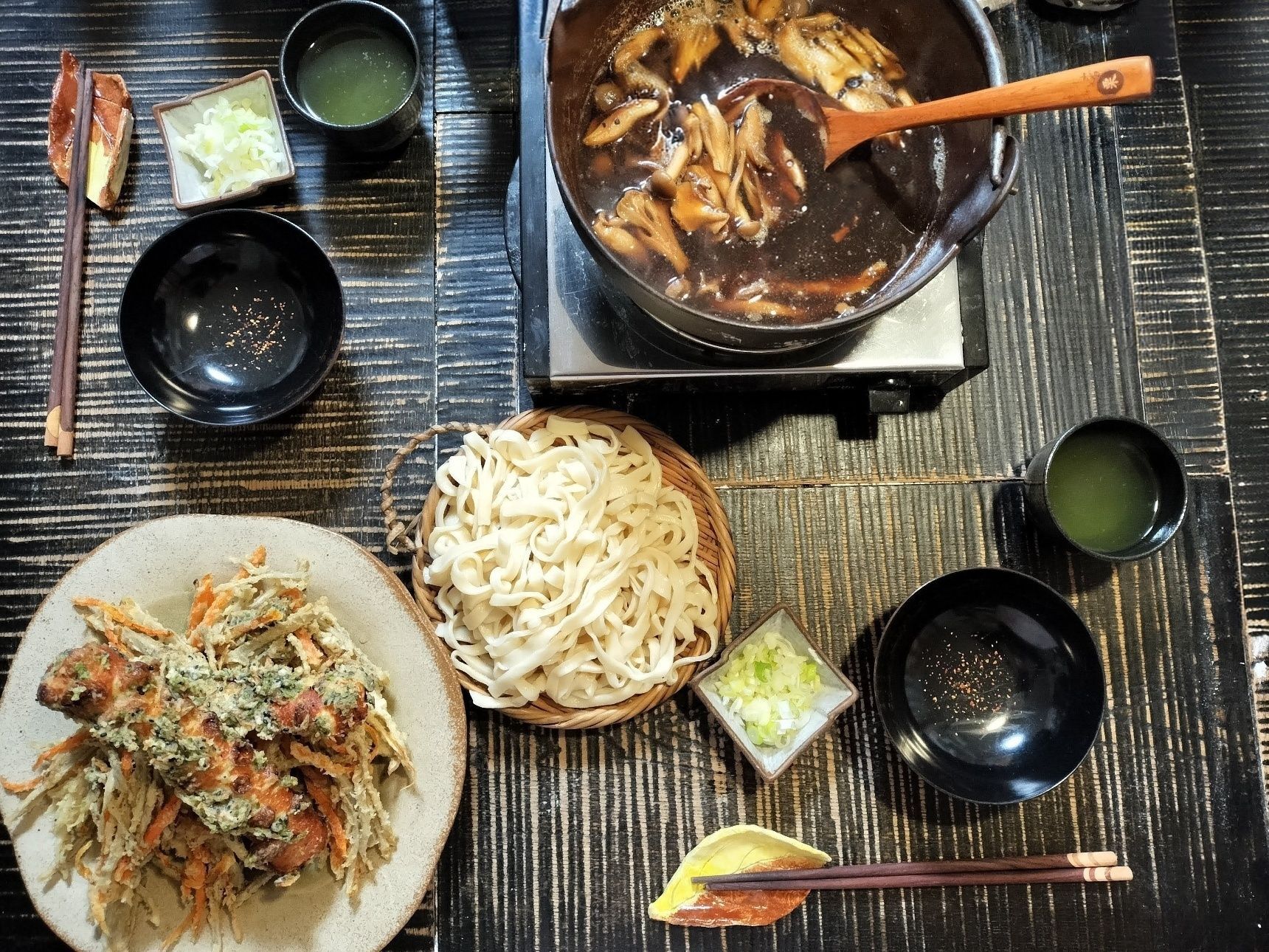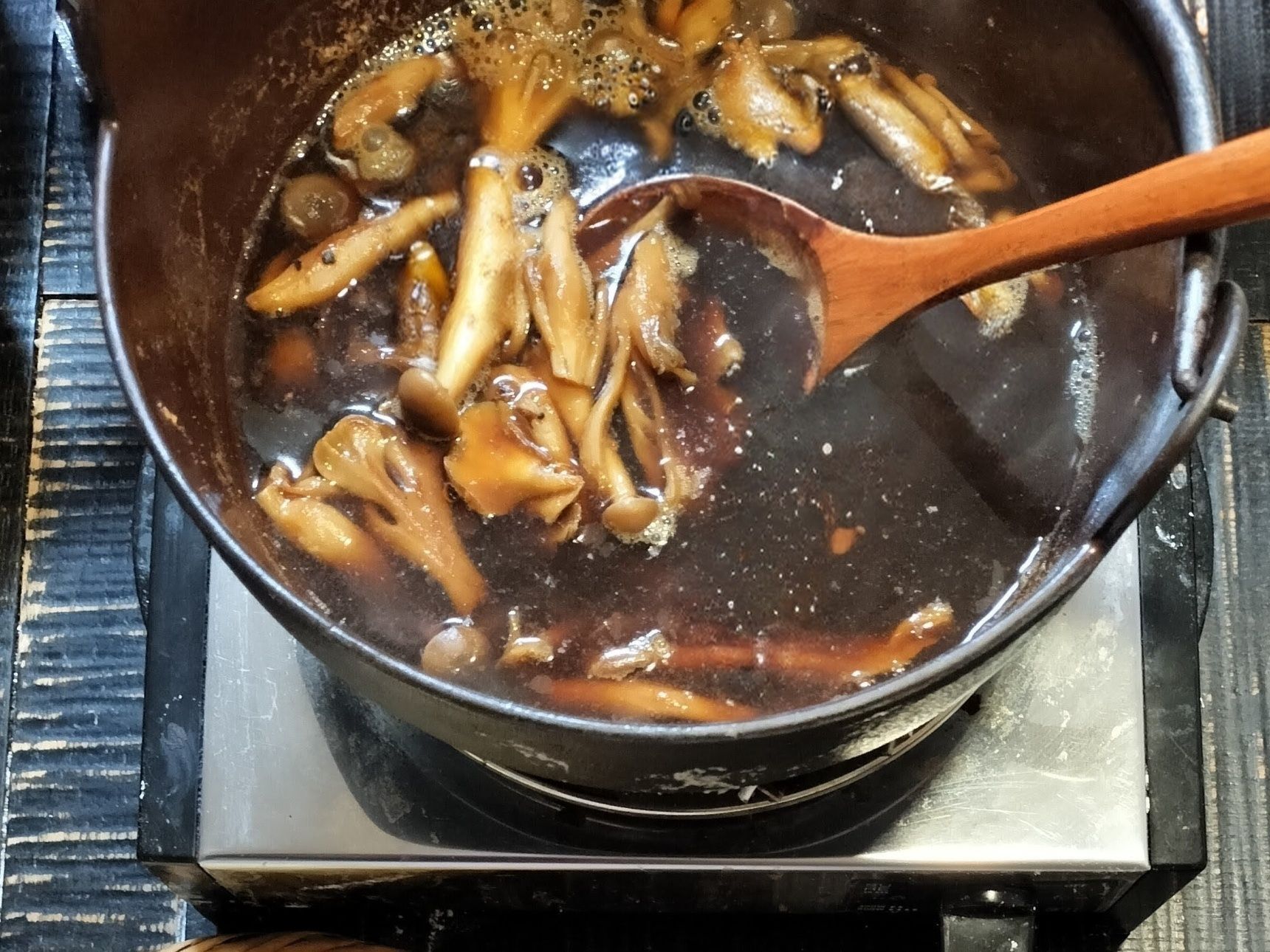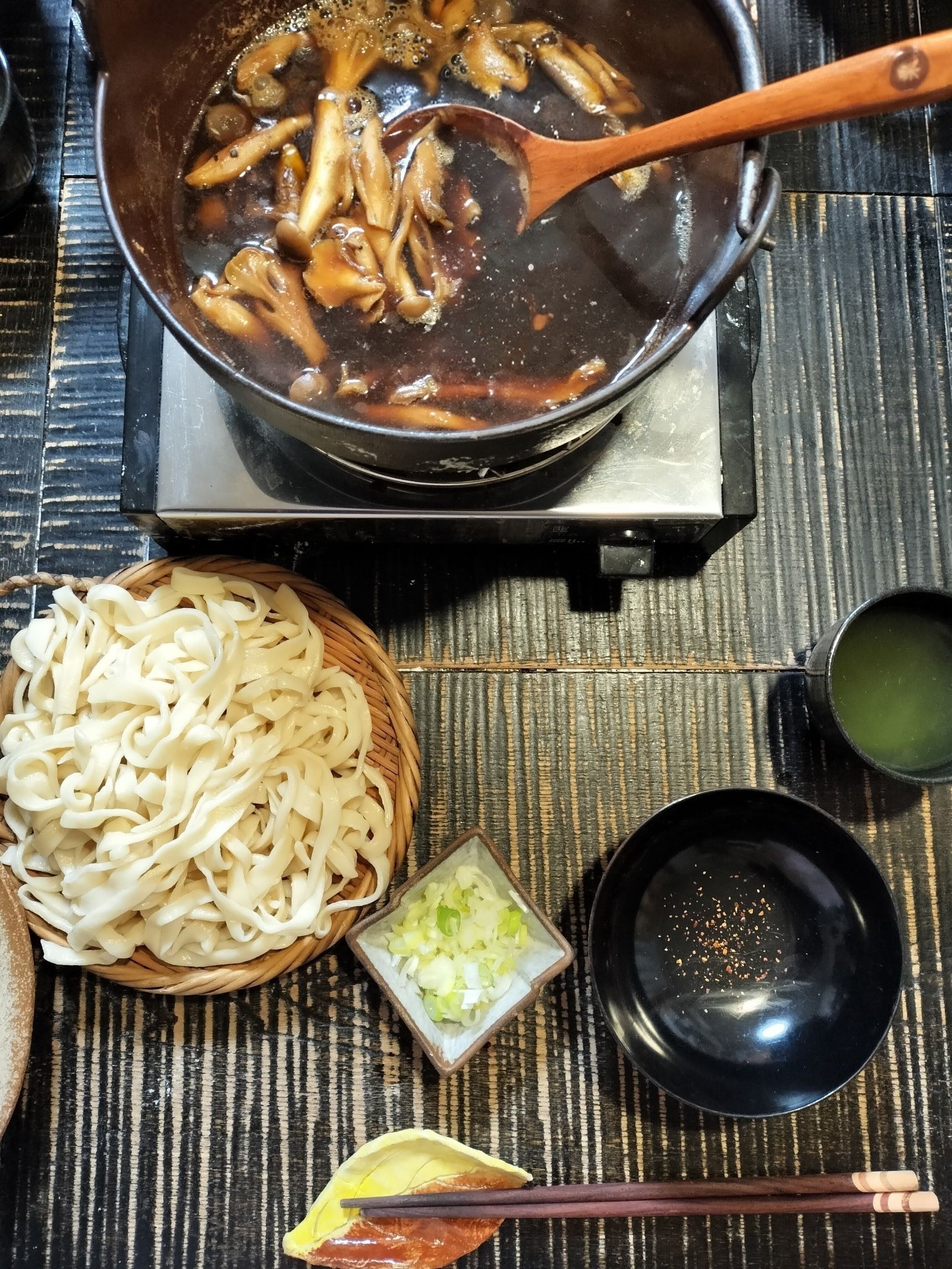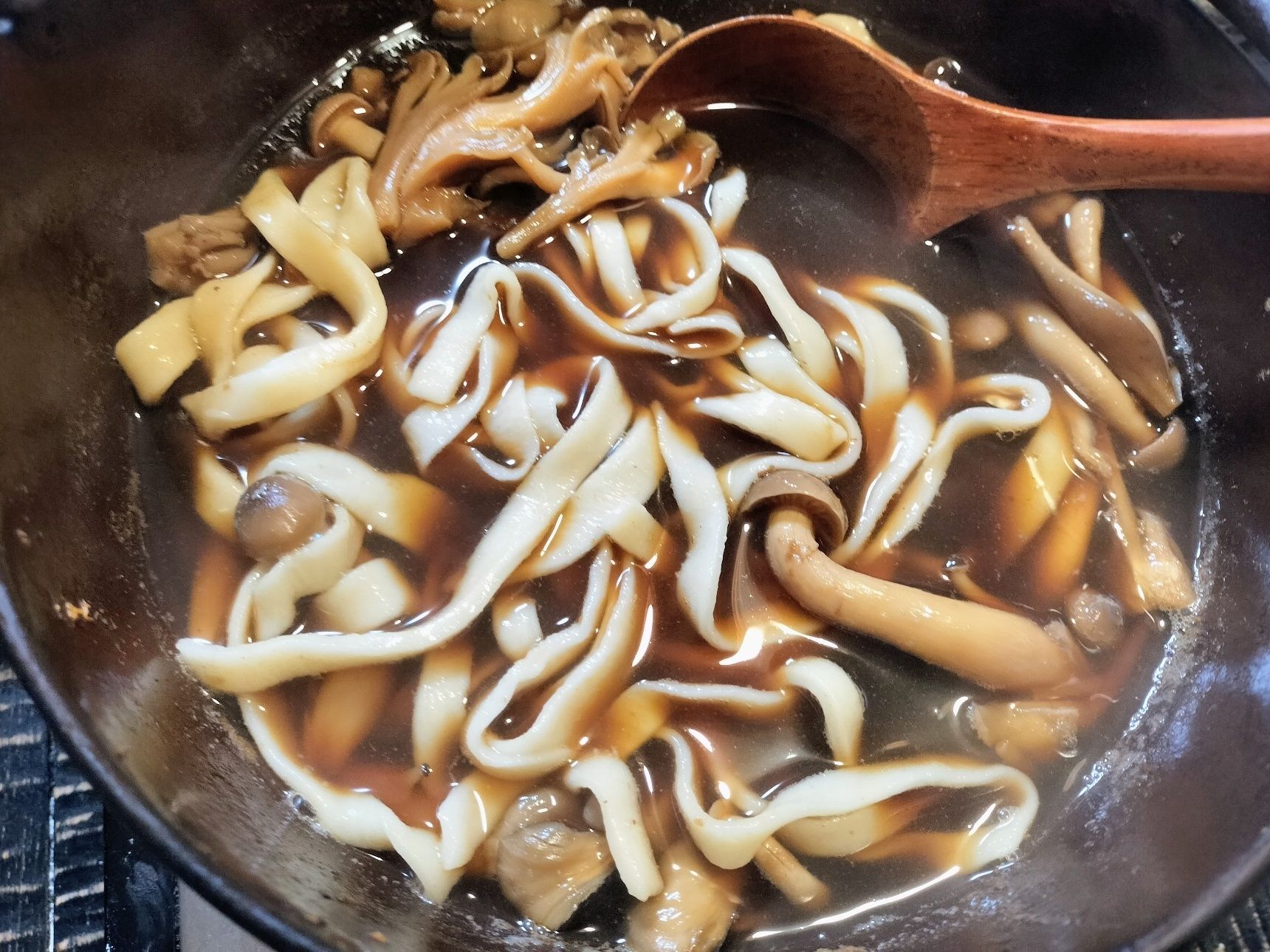きのこたっぷり鴨出汁に、うどんを入れて、数分煮込む【煮込みうどん】