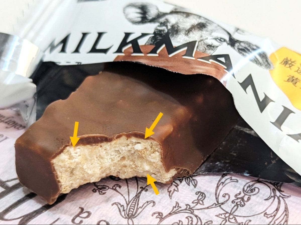 コクのある乳感を実現する「練乳パウダー」と、濃厚な「クリーム風味パウダー」を1:1の黄金比で配合しているそうです。しかもあの不思議な食感はバタークッキーのさくほろ食感だそうです。