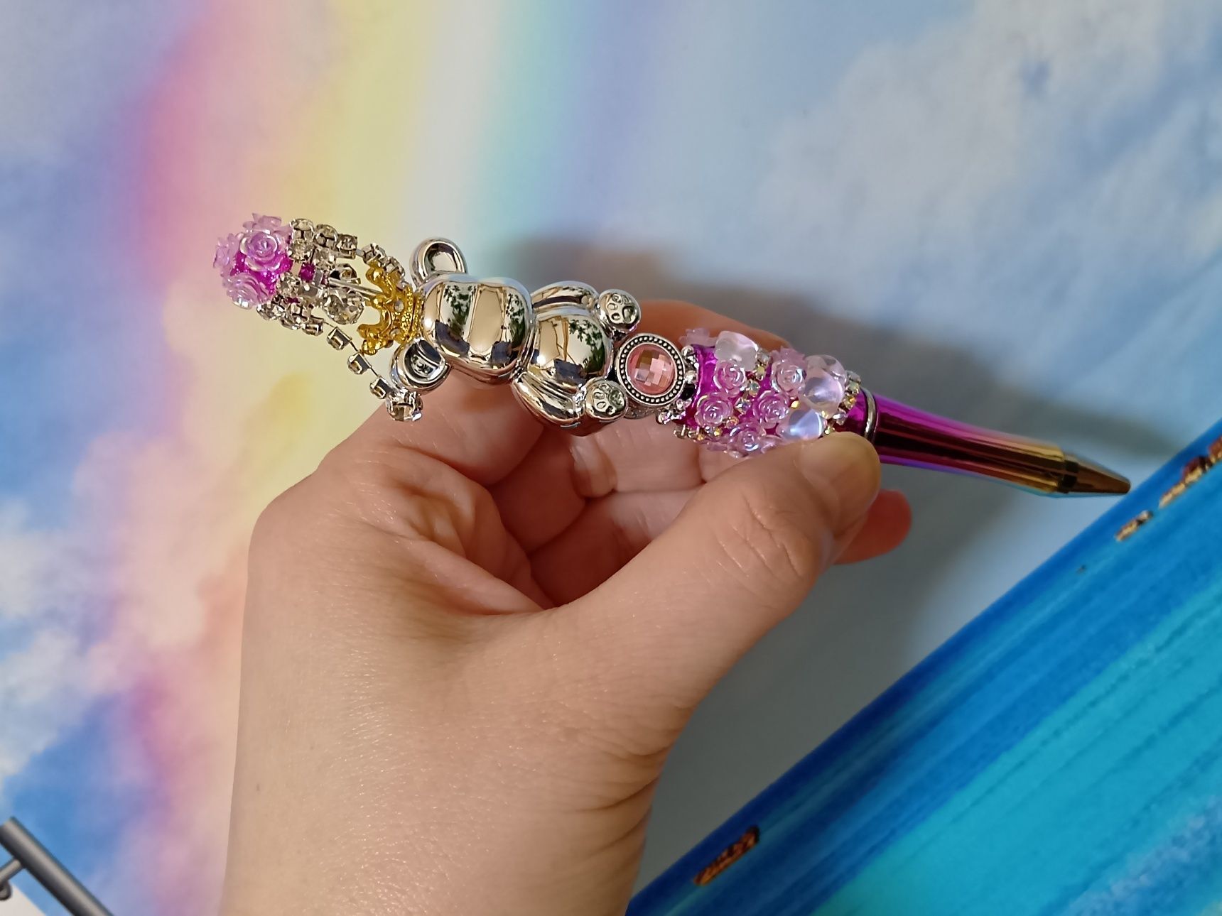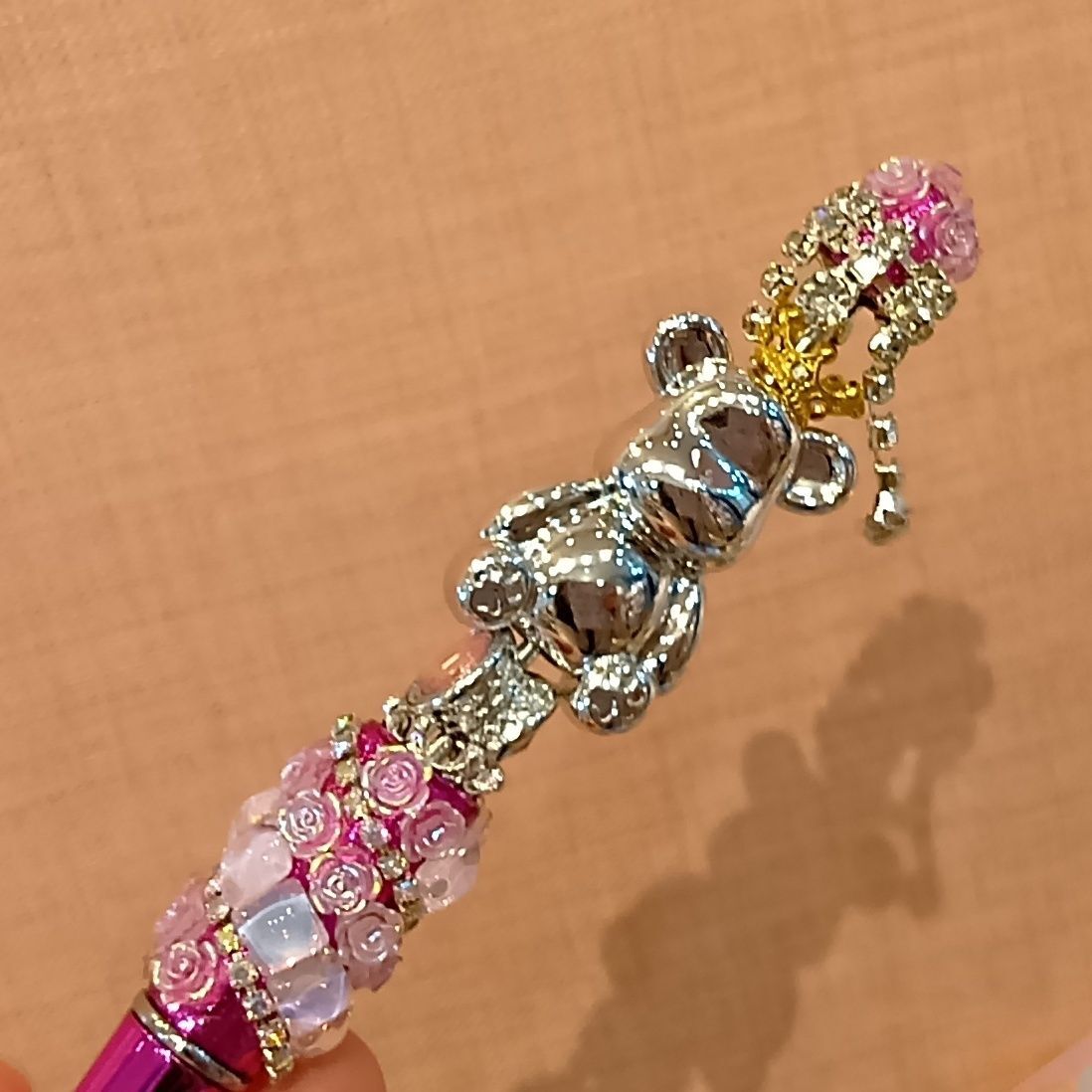 ゴールドの王冠をかぶったプラチナ色のベアーさんに、キラキラ輝くビーズも足してみました!