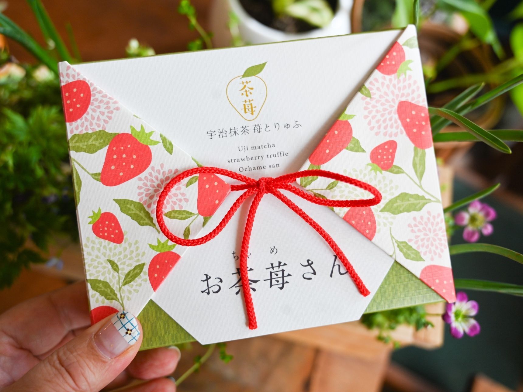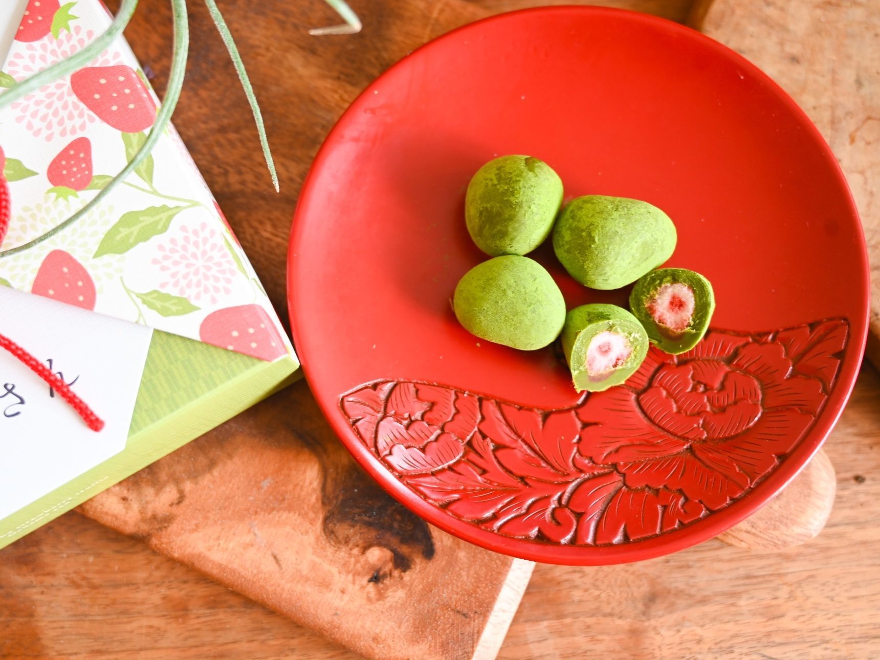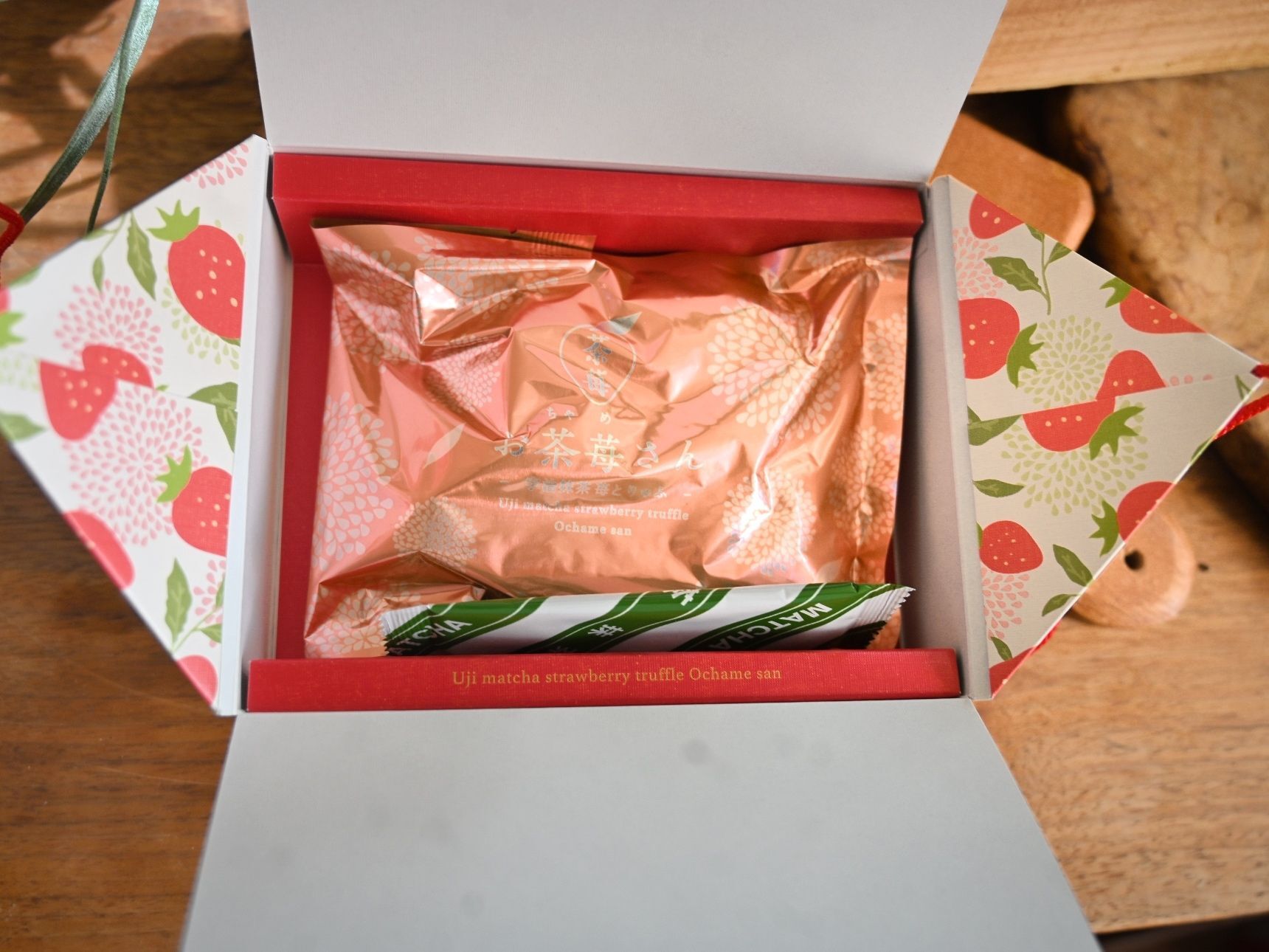 上薄茶用抹茶を使用し、濃厚な抹茶チョコレートで苺を包んでいます。
