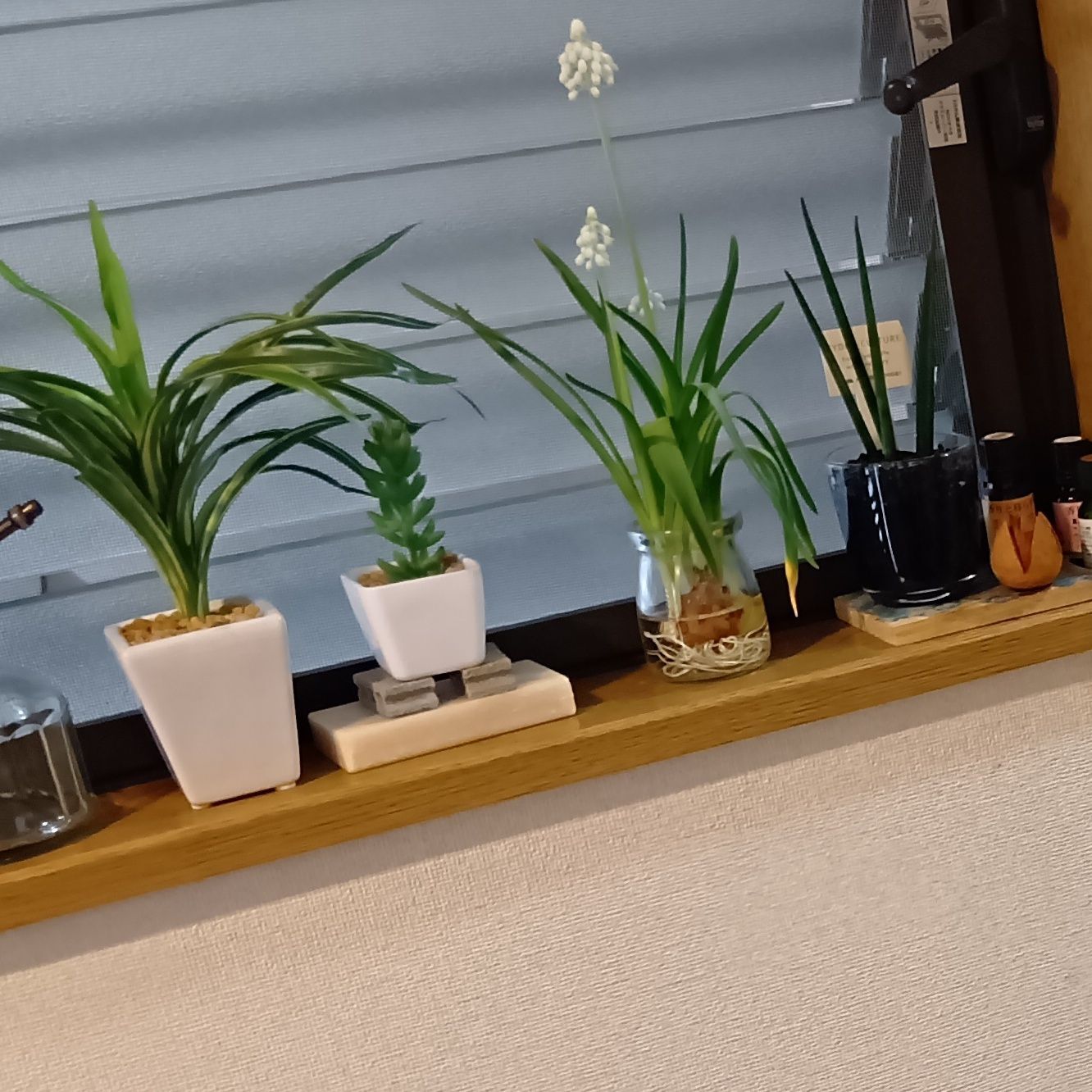 ちなみに、右側のグリーンはサンスベリアで、白い花が咲いているのは白いムスカリです。