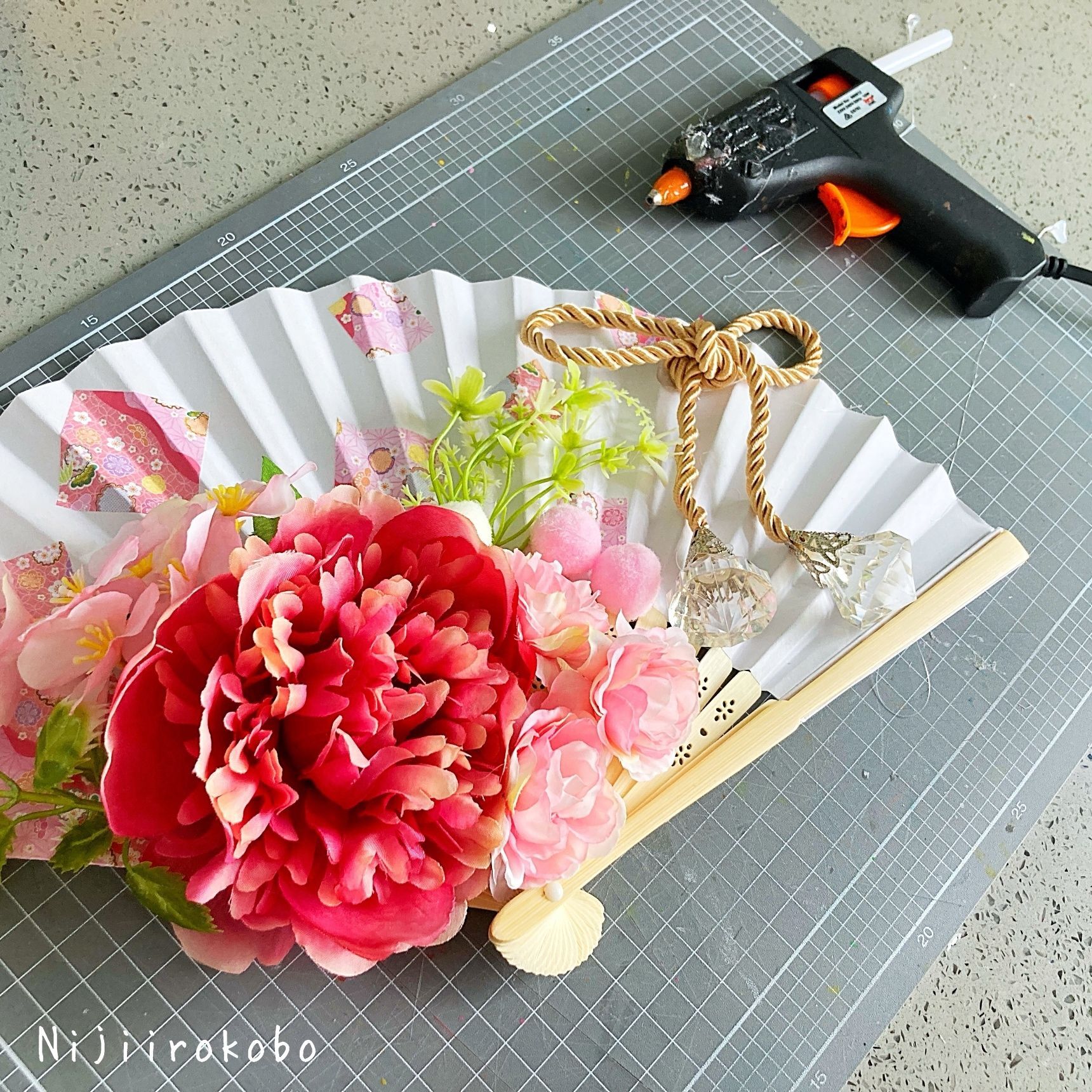 2. ホットグルーで、造花や他の飾りを扇子に接着していく。