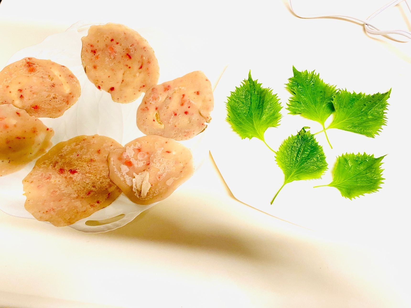 ⑤大葉は水で洗い、キッチンペーパーでよく水気をふき取ります。④の生地で俵型に丸めたこし餡を包む、大葉に包みます。