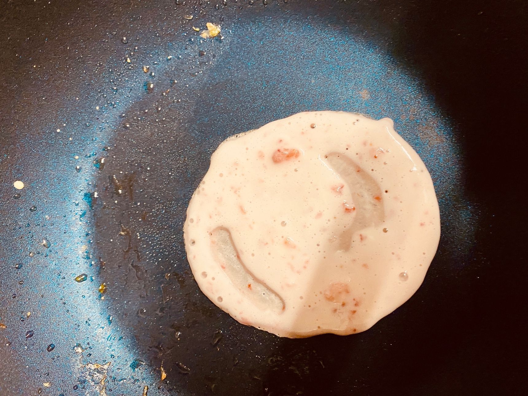 ④フライパンを温め、薄く油をひきます。③の生地を少し入れて、弱火でよく伸ばして丸くしながら焼きます。