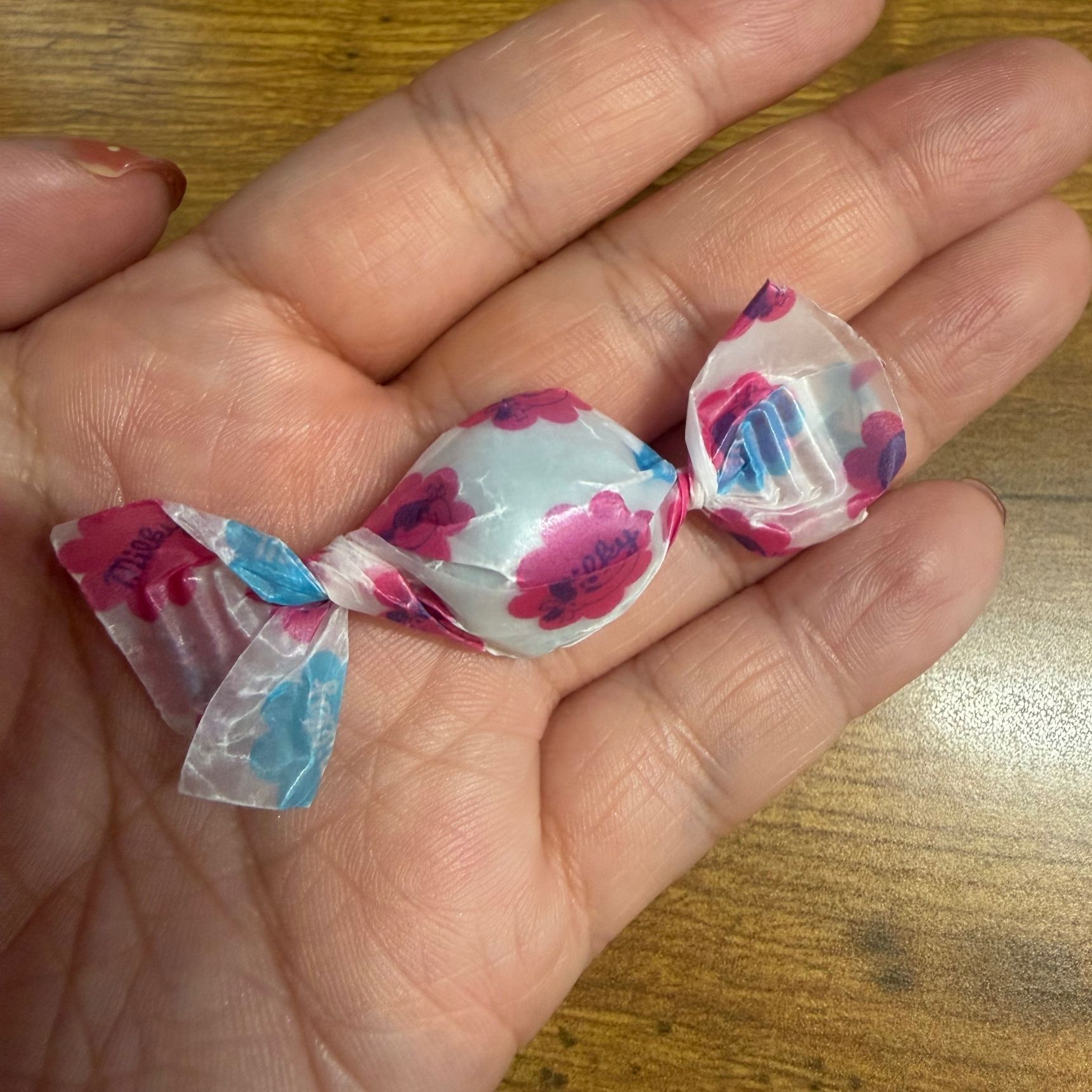 ミルキーといつつハイチュウのような個包装かとおもいきや、ちゃんとミルキーのキャンディスタイルのパッケージ。薄っすら見える青色が期待を煽ります(笑)。