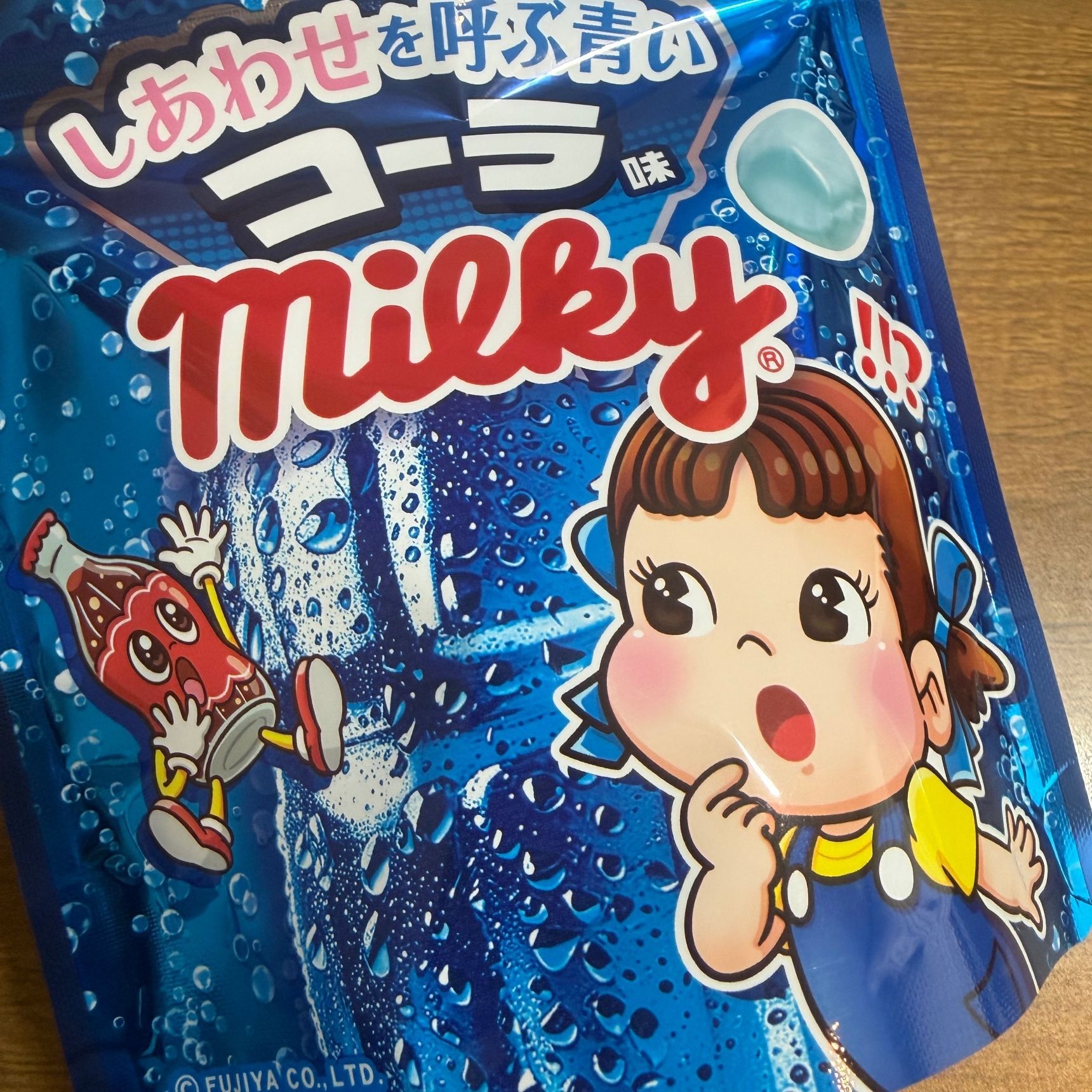 次はミルキーのしあわせを呼ぶ青いコーラ味?コーラなのに、青いの?疑問がいっぱいでいつの間にか手に取っていました。