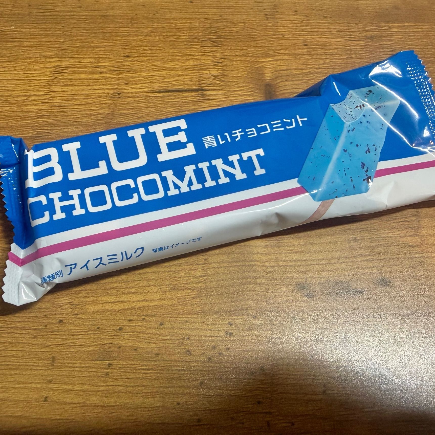 大好物のこれ!青いチョコミント!たしかにチョコミントはグリーンなイメージなので、これは面白い。チョコミントのフォントもローソンのロゴみたいで開けるのが楽しみです。